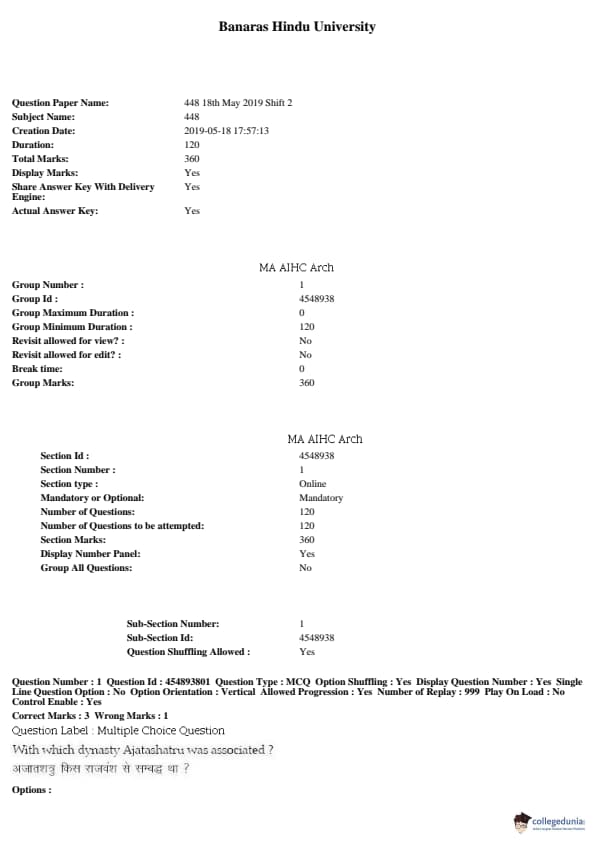 BHU PET 2019 M.A AIHC Question paper with answer key pdf conducted on May 18, 2019 in Shift 2 is available for download. The exam was successfully organized by Banaras Hindu University (BHU). The question paper comprised a total of 120 questions.