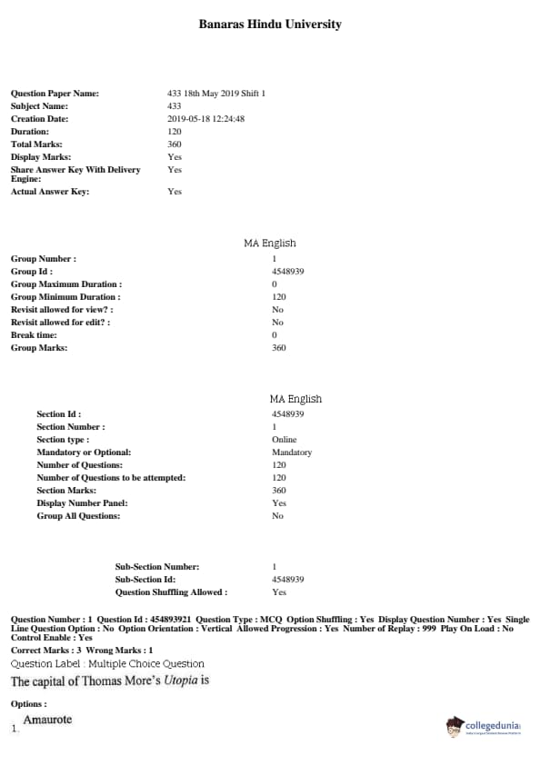 BHU PET 2019 M.A. ENGLISH Question paper with answer key pdf conducted on May 18, 2019 in Shift 1 is available for download. The exam was successfully organized by Banaras Hindu University (BHU). The question paper comprised a total of 120 questions.