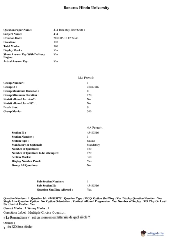 BHU PET 2019 MA FRENCH Question Paper with Answer Key PDFs, Shift 1
