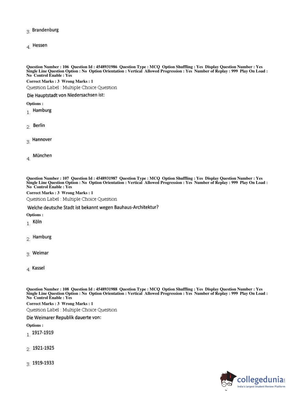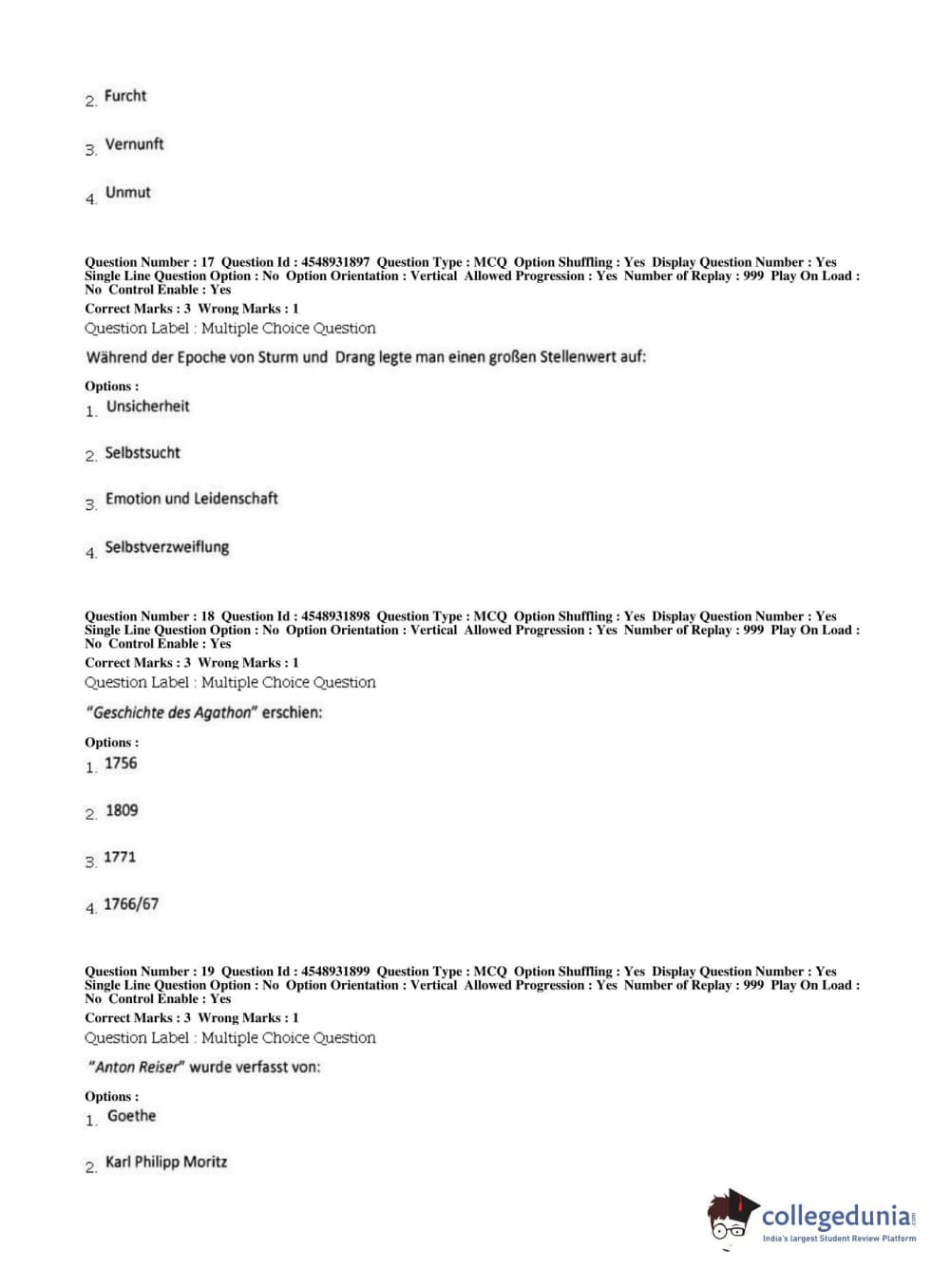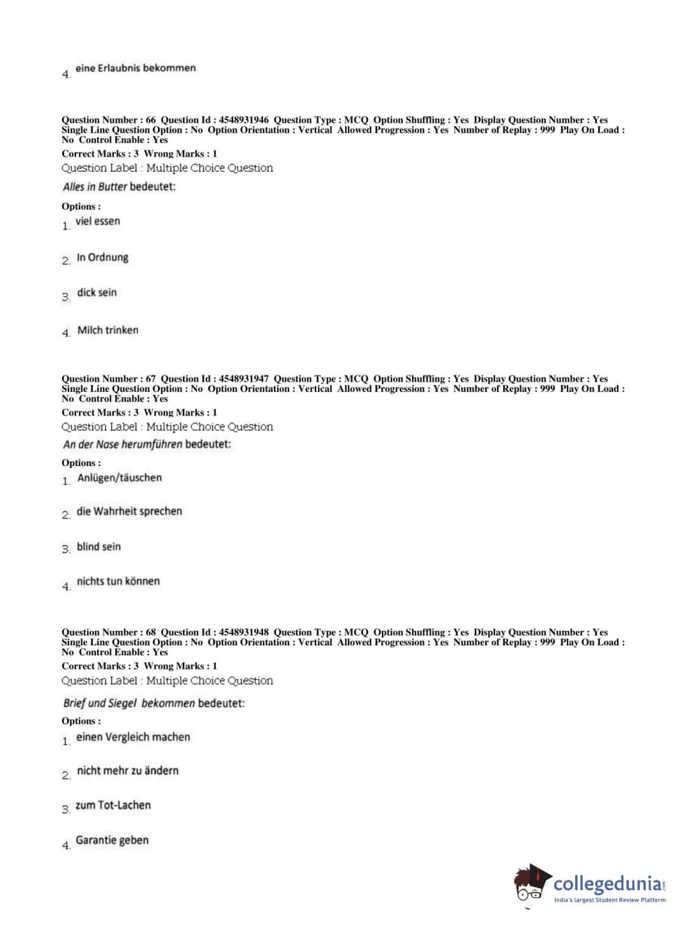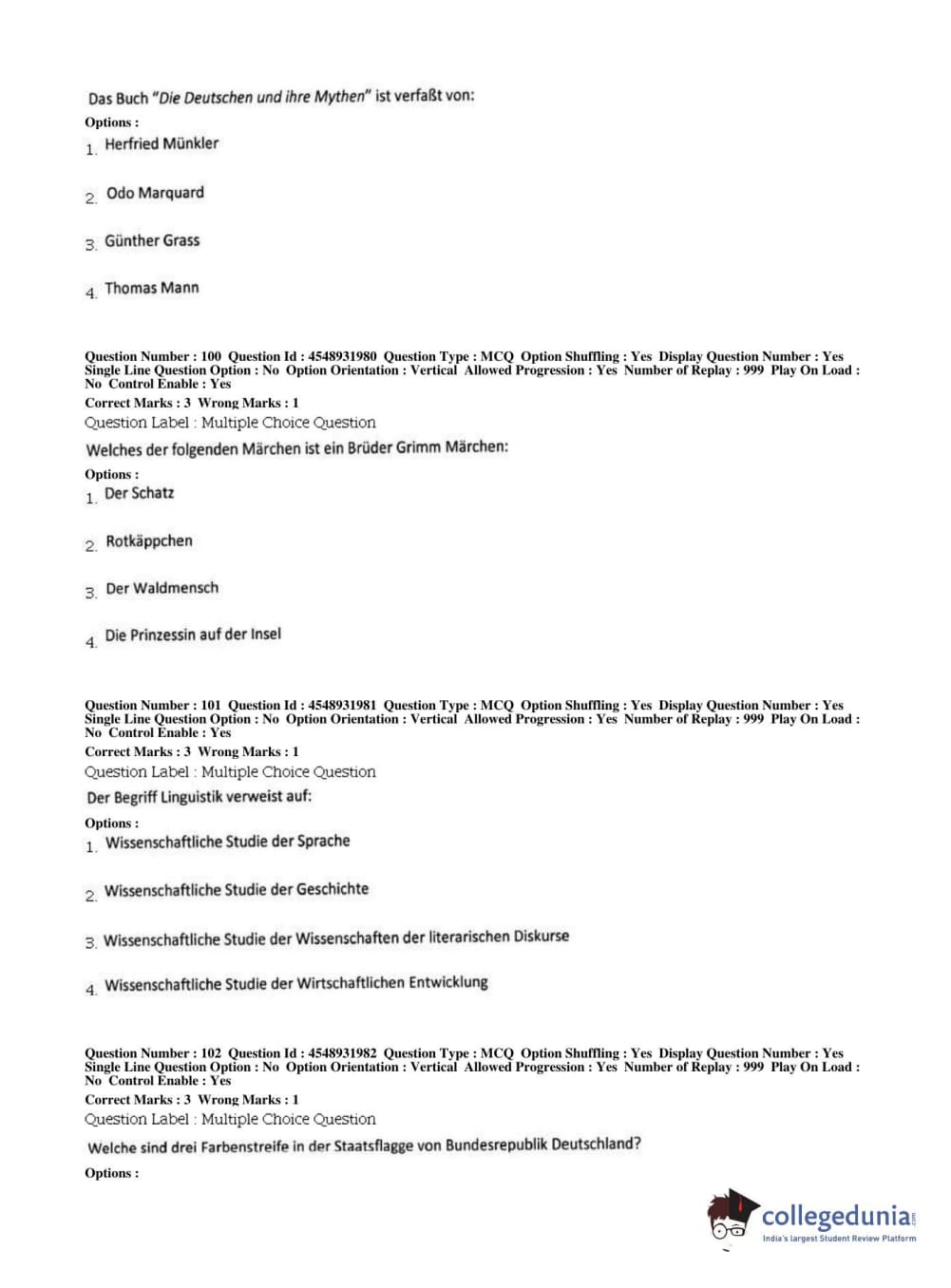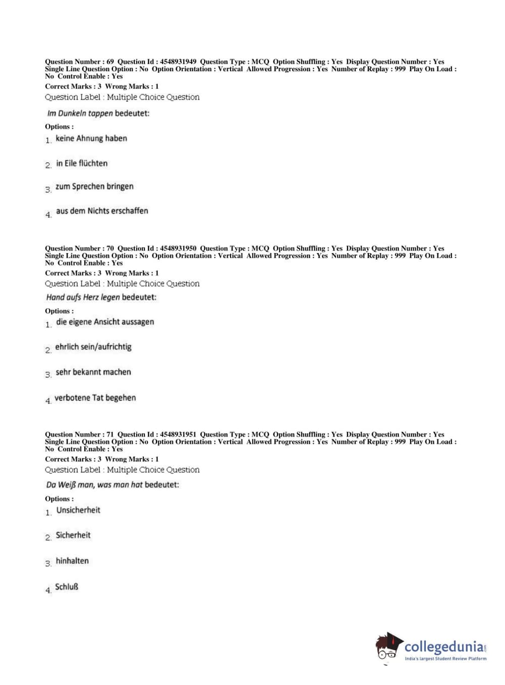 BHU PET 2019 M.A German Question Paper with Answer Key PDFs, Shift 1