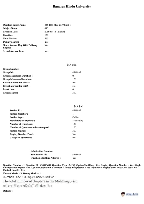 BHU PET 2019 MA PALI Question paper with answer key pdf conducted on May 18, 2019 in Shift 1 is available for download. The exam was successfully organized by Banaras Hindu University (BHU). The question paper comprised a total of 120 questions.