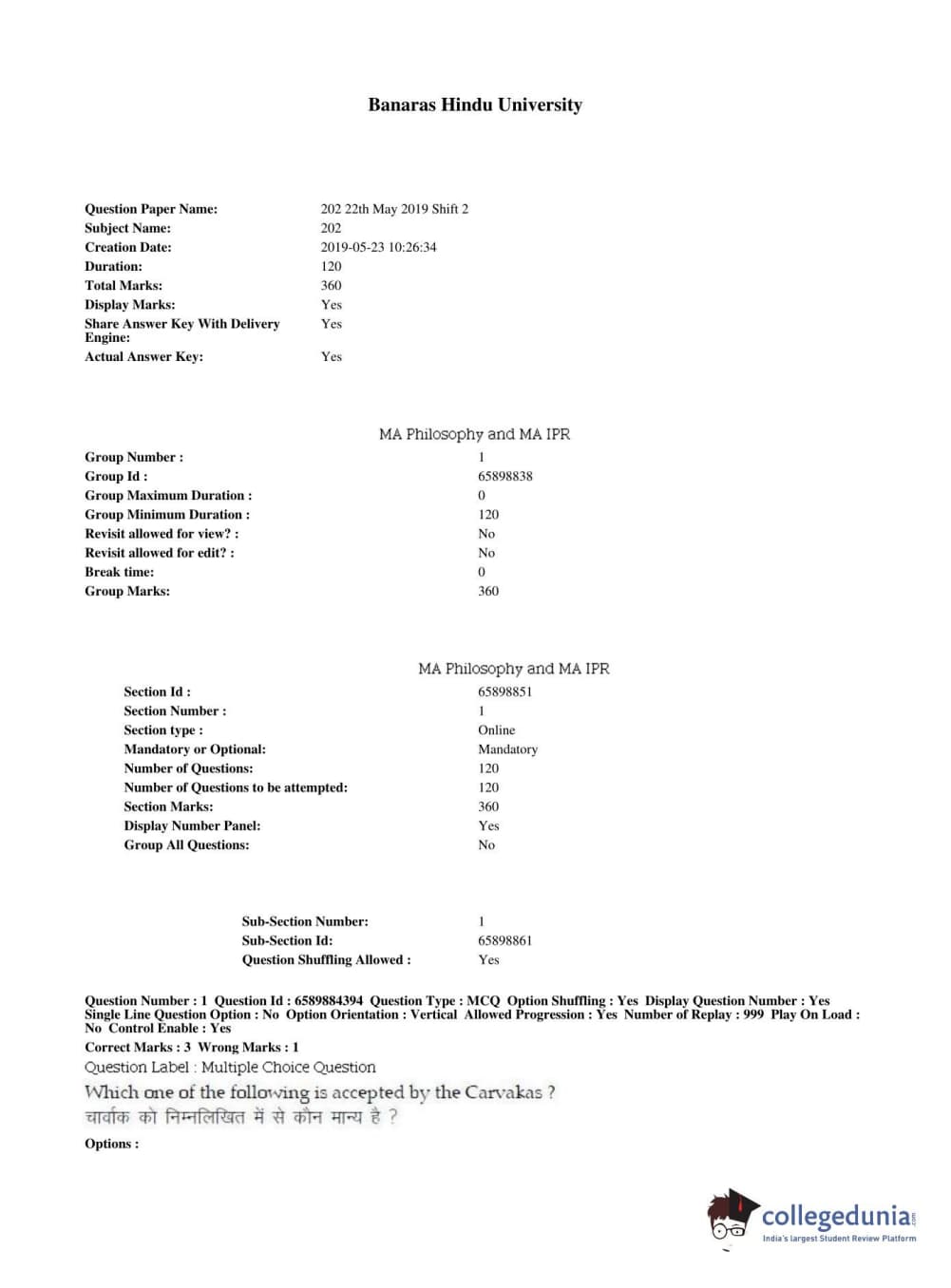 BHU PET 2019 MA PHILOSOPHY AND MA IPR Question paper with answer key pdf conducted on May 22, 2019 in Shift 2 is available for download. The exam was successfully organized by Banaras Hindu University (BHU). The question paper comprised a total of 120 questions.