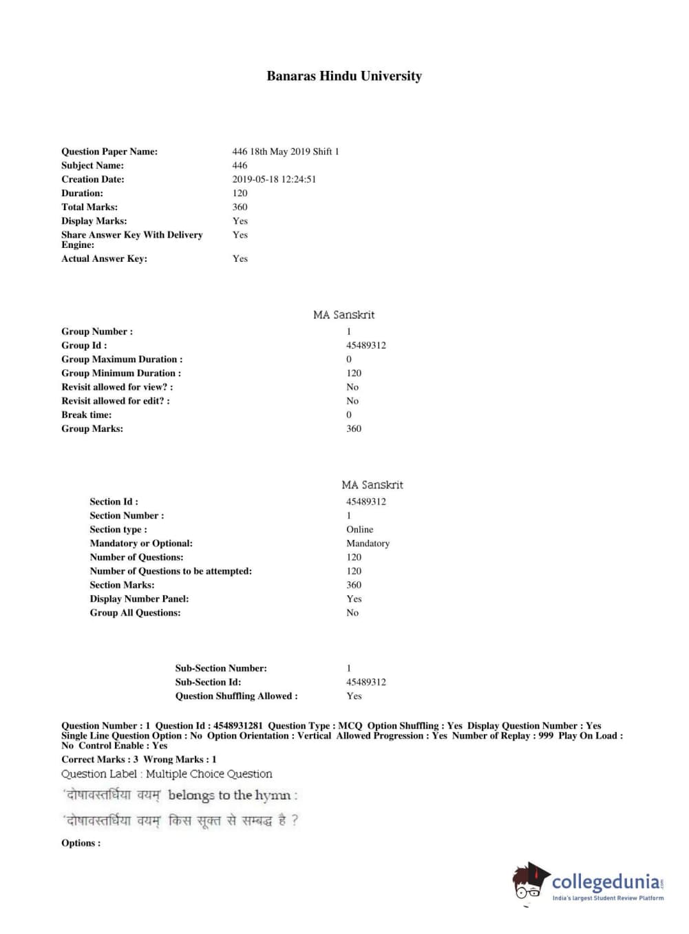 BHU PET 2019 MA SANSKRIT Question paper with answer key pdf conducted on May 18, 2019 in Shift 1 is available for download. The exam was successfully organized by Banaras Hindu University (BHU). The question paper comprised a total of 120 questions.