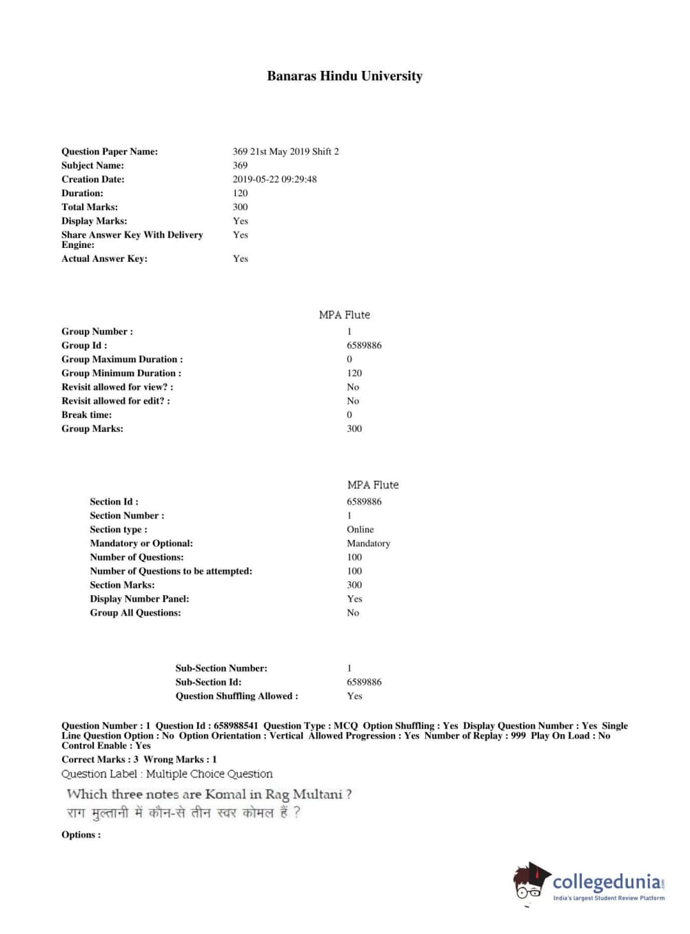 BHU PET 2019 MPA FLUTE Question Paper with Answer Key PDFs, Shift 2