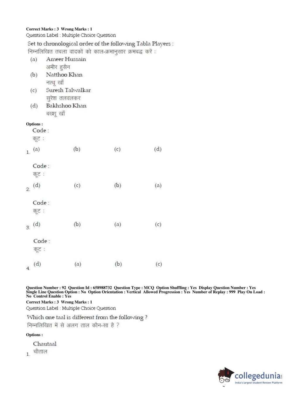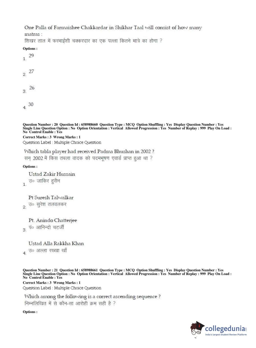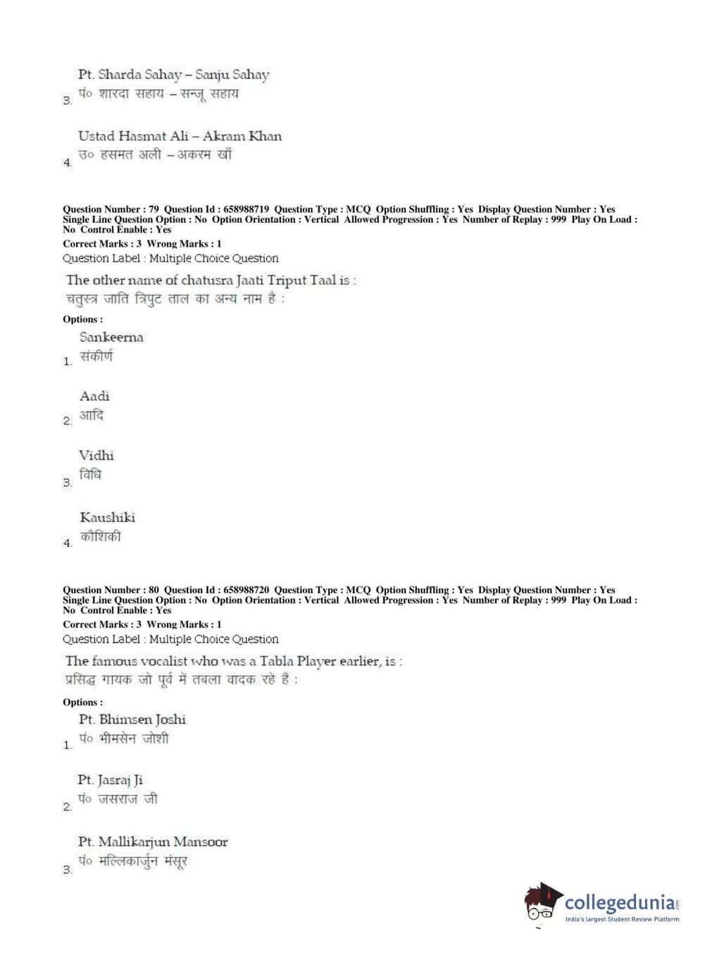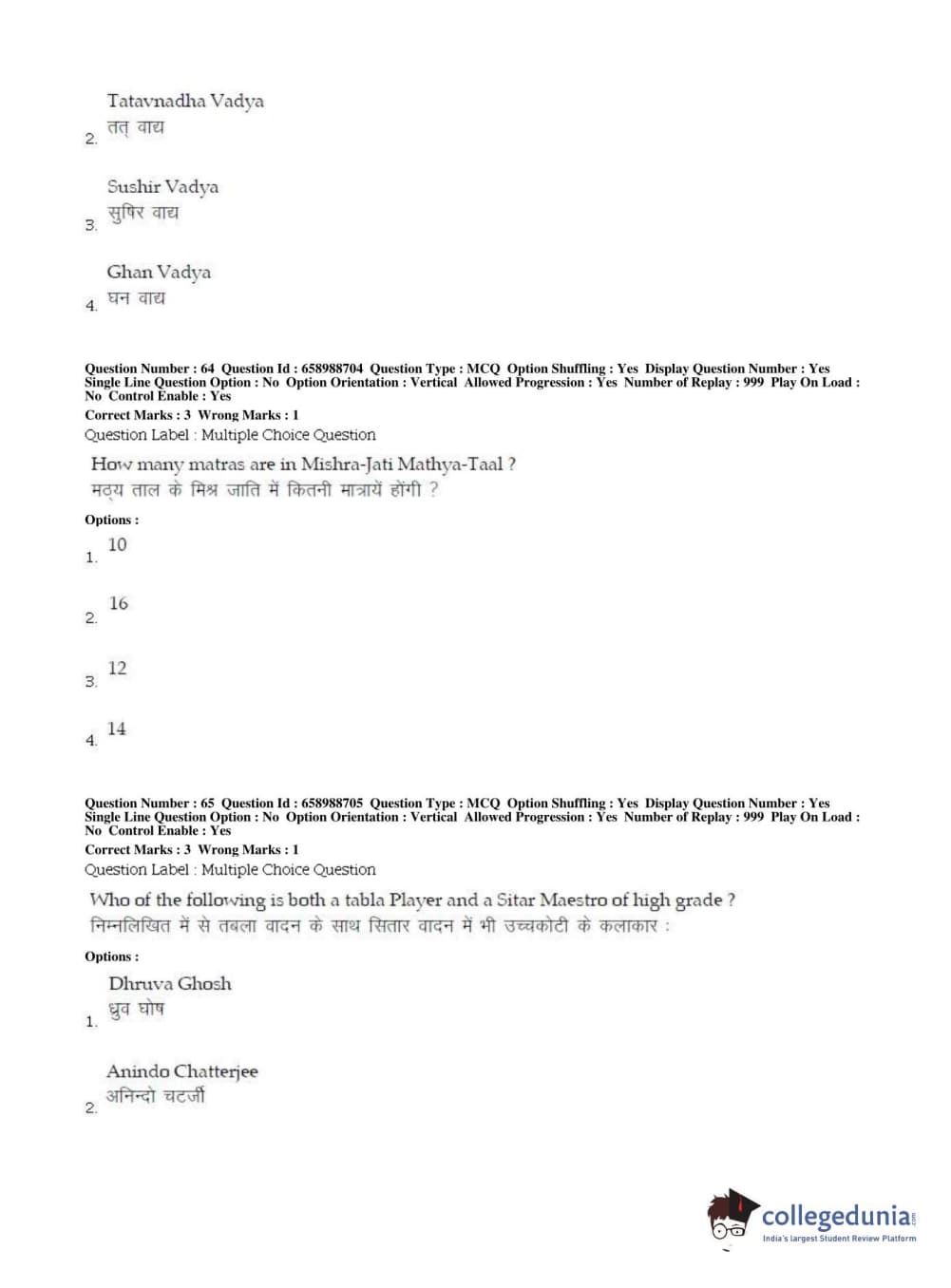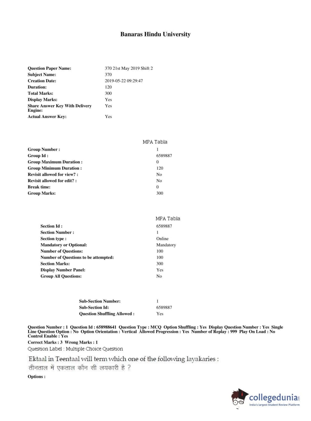 BHU PET 2019 MPA TABLA Question Paper with Answer Key PDFs, Shift 2