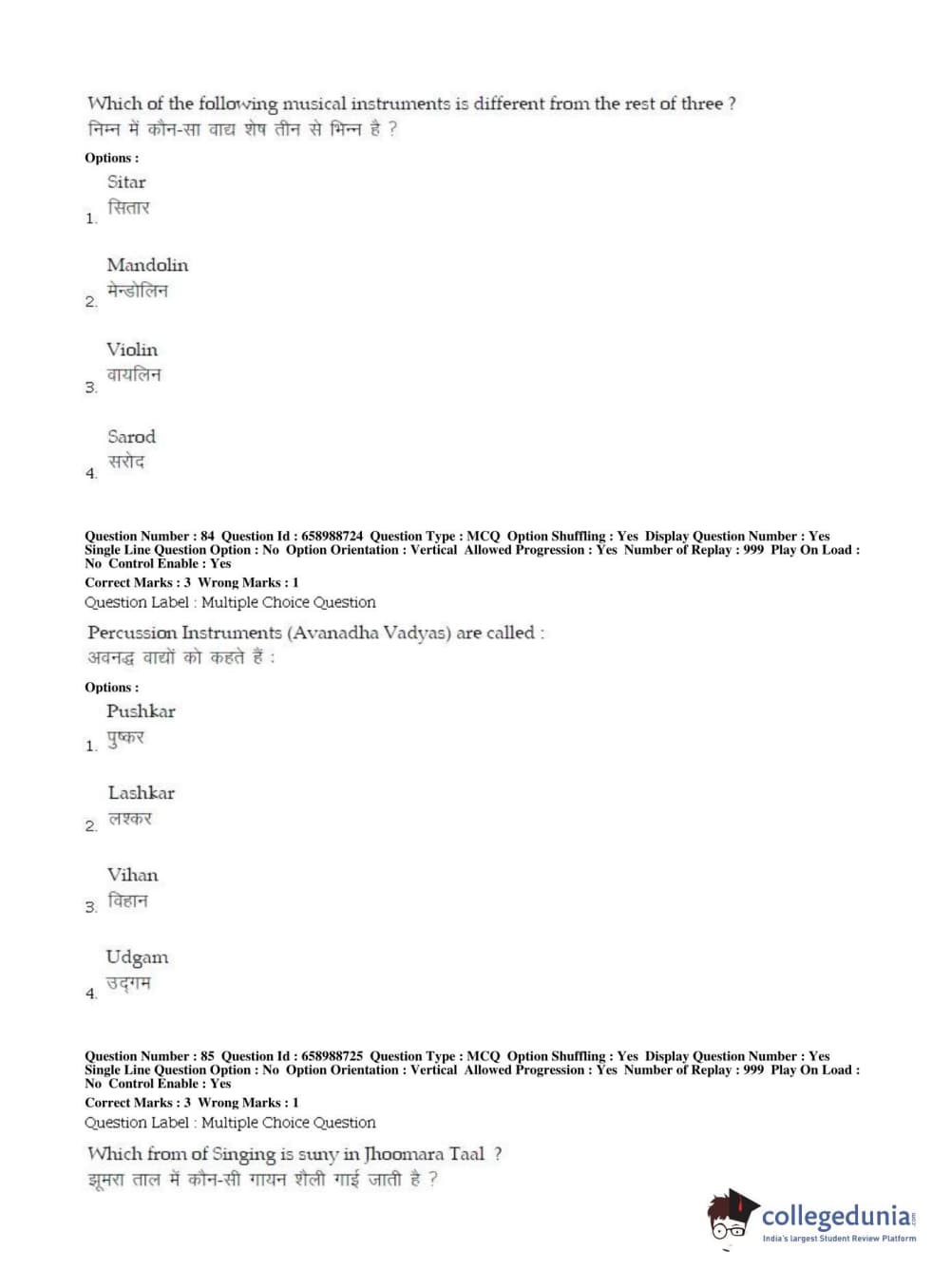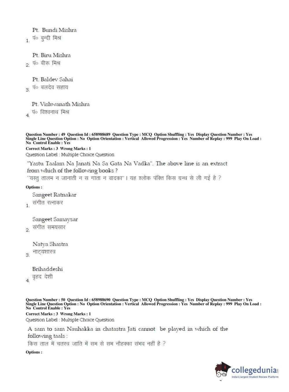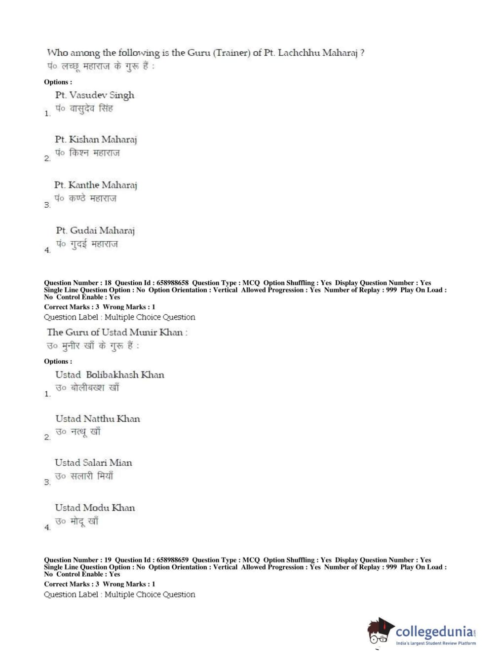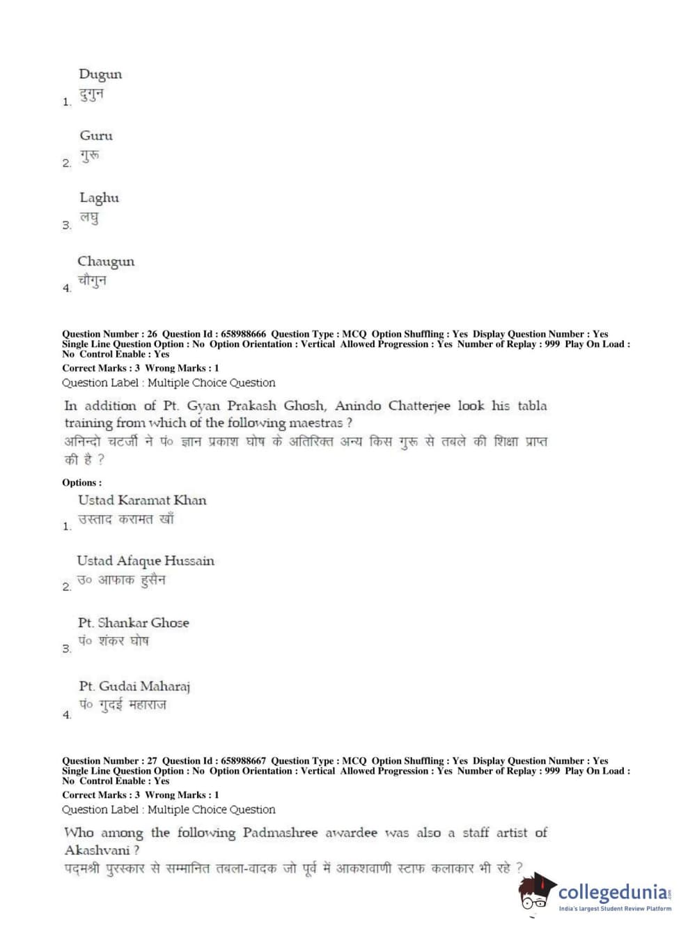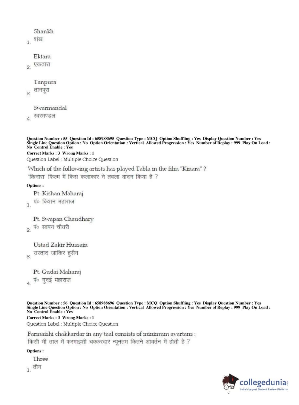 BHU PET 2019 MPA TABLA Question Paper with Answer Key PDFs, Shift 2