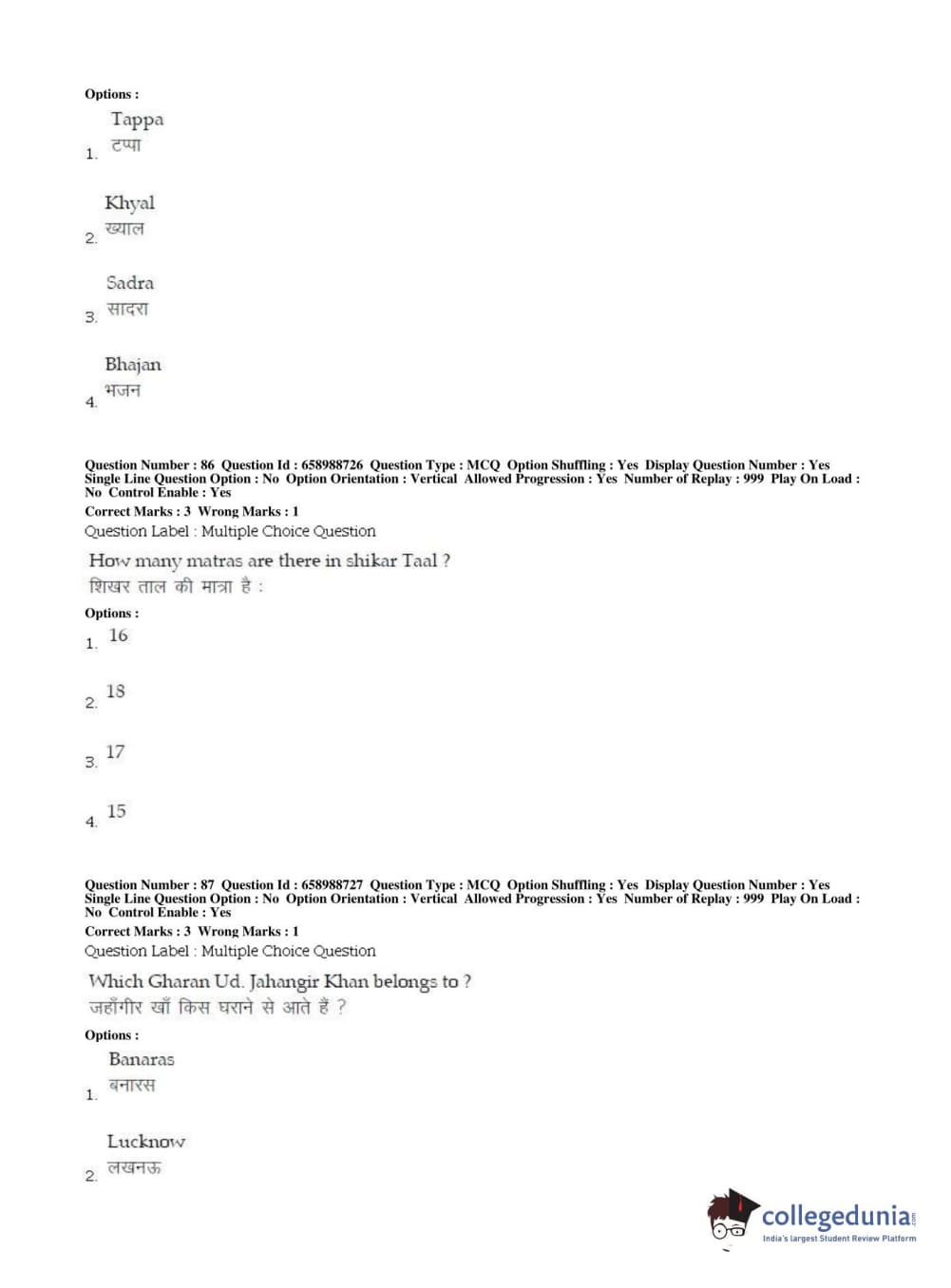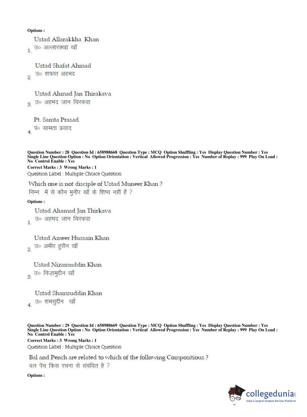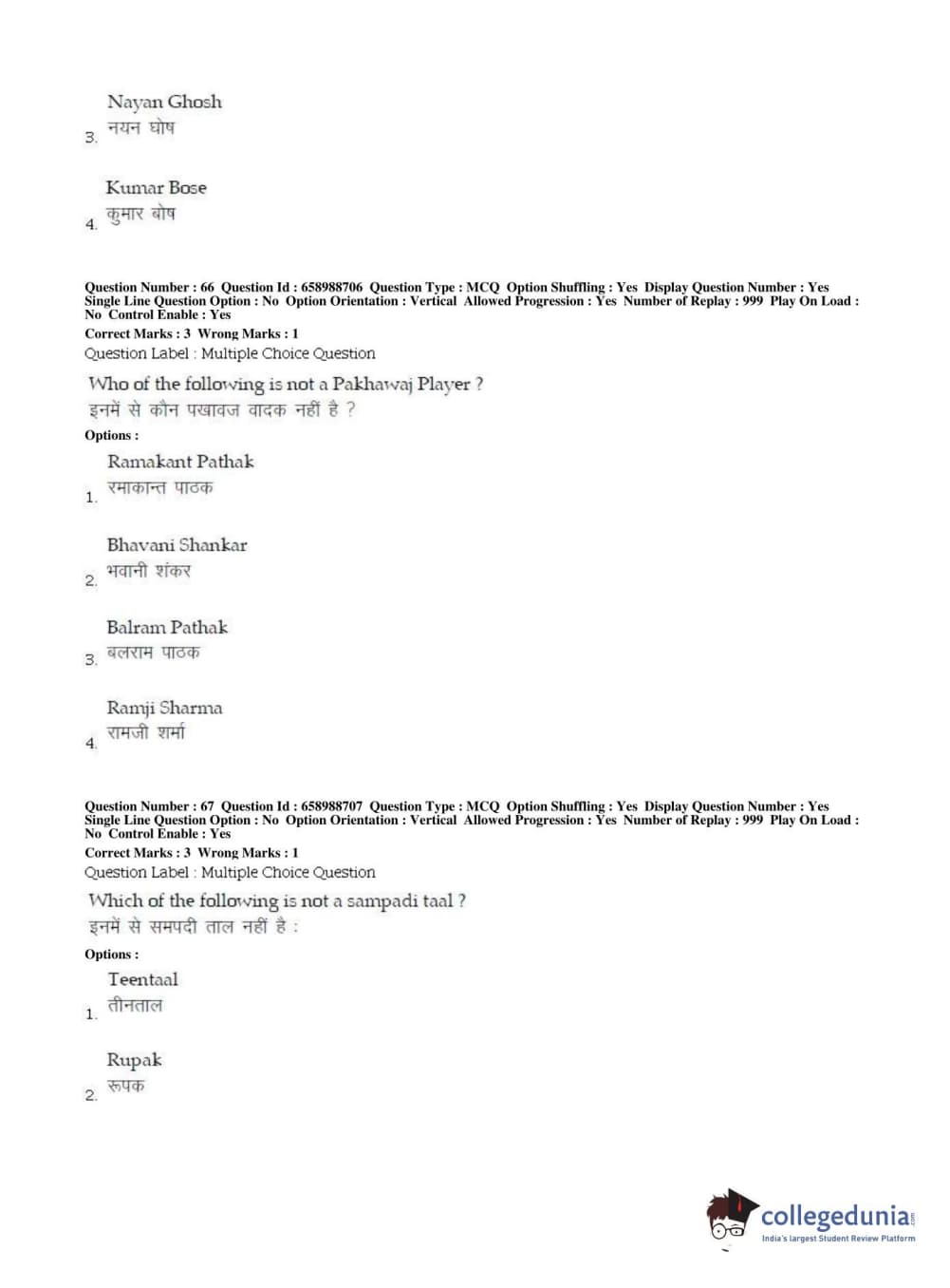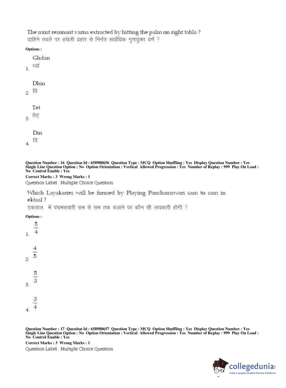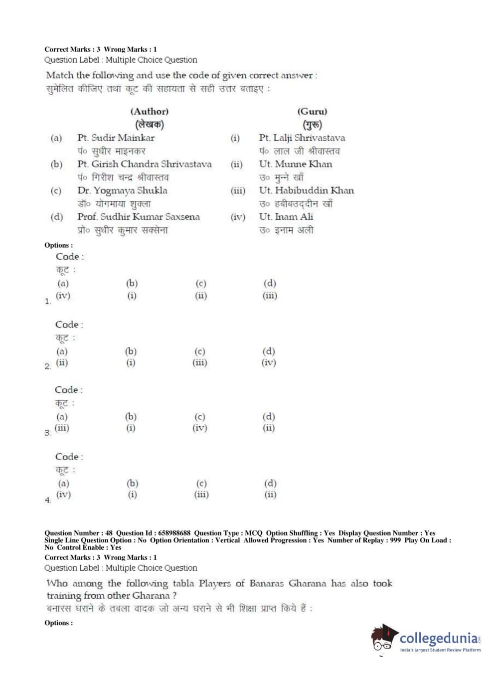 BHU PET 2019 MPA TABLA Question Paper with Answer Key PDFs, Shift 2
