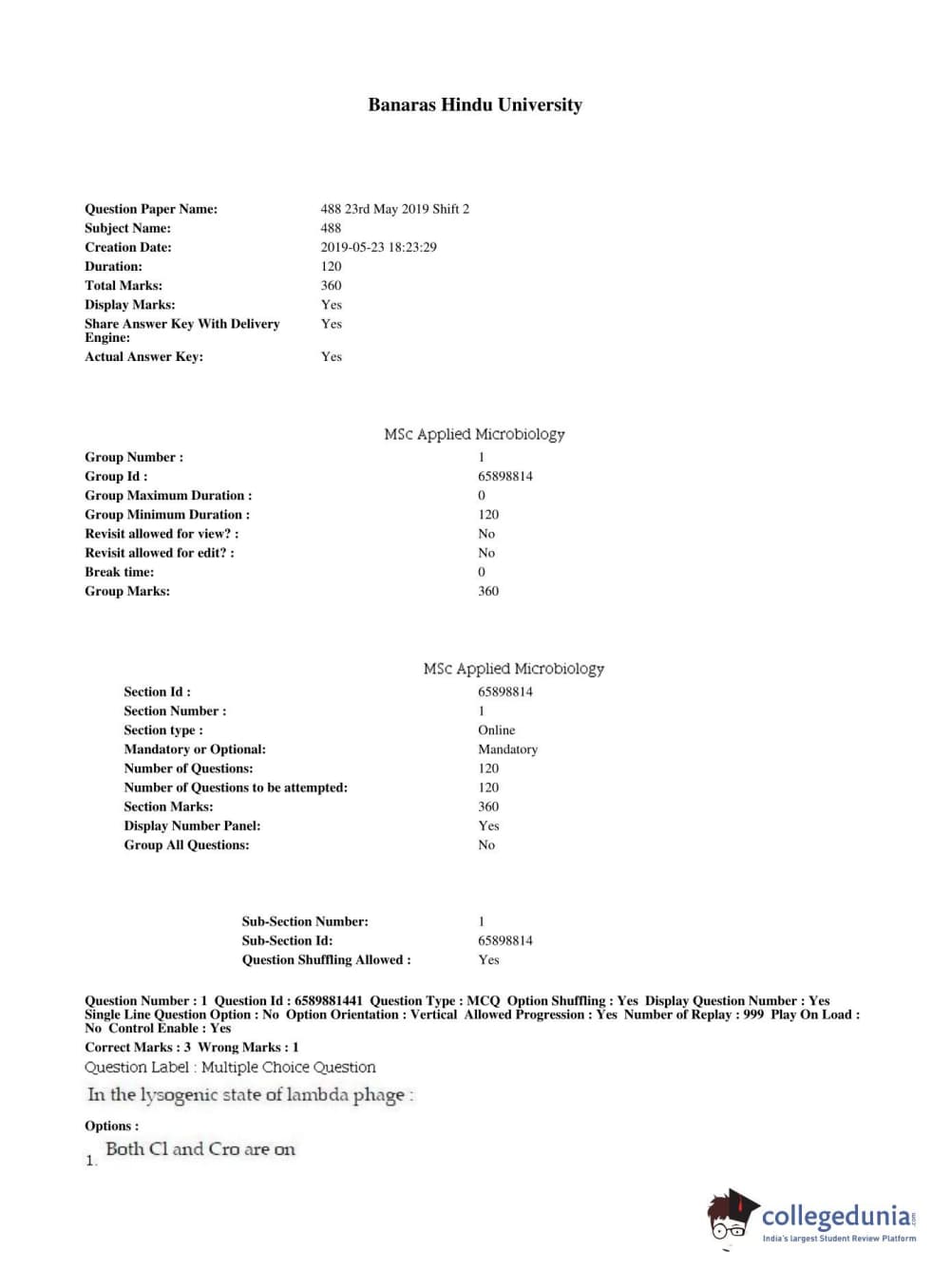 BHU PET 2019 MSC APPLIED MICROBIOLOGY Question paper with answer key pdf conducted on May 23, 2019 in Shift 2 is available for download. The exam was successfully organized by Banaras Hindu University (BHU). The question paper comprised a total of 120 questions.