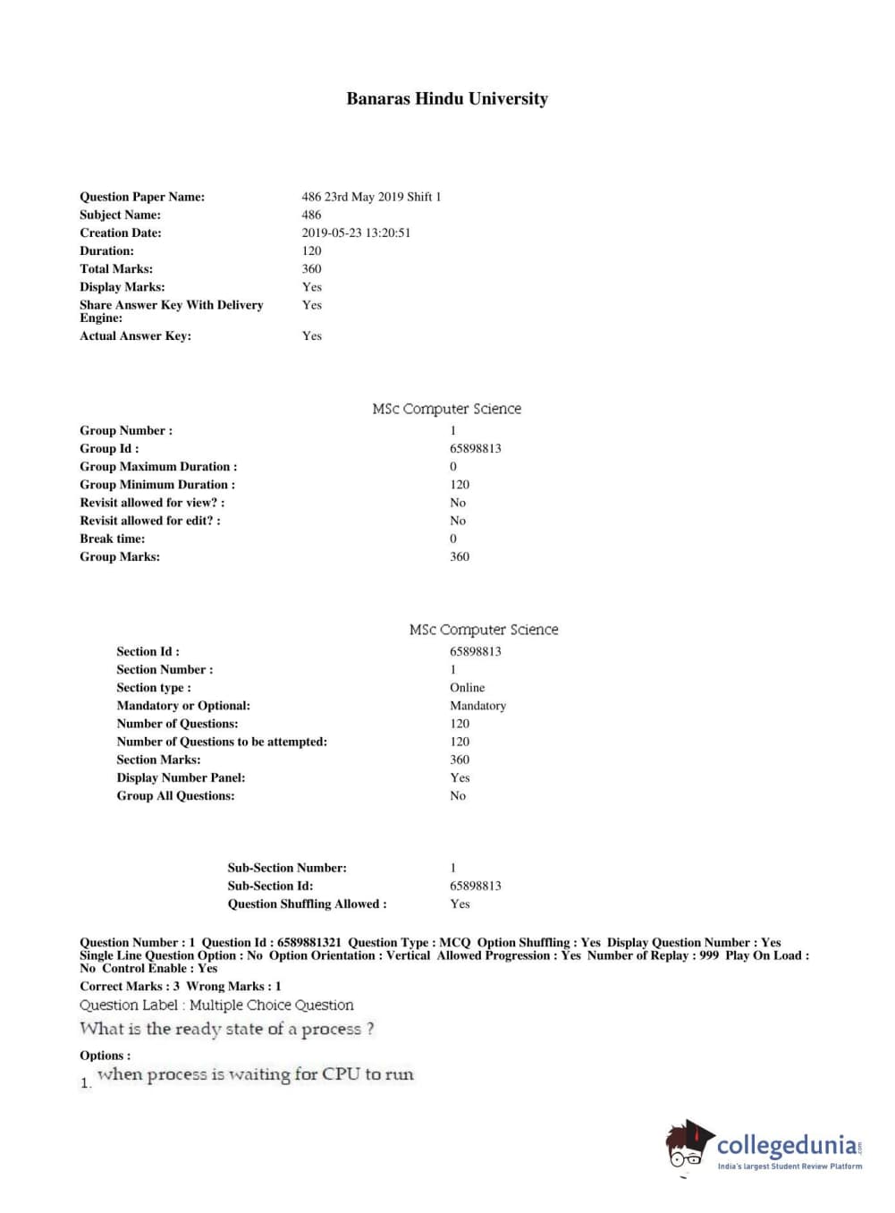 BHU PET 2019 MSC COMPUTER SCIENCE Question Paper with Answer Key PDFs in English ,Shift 1