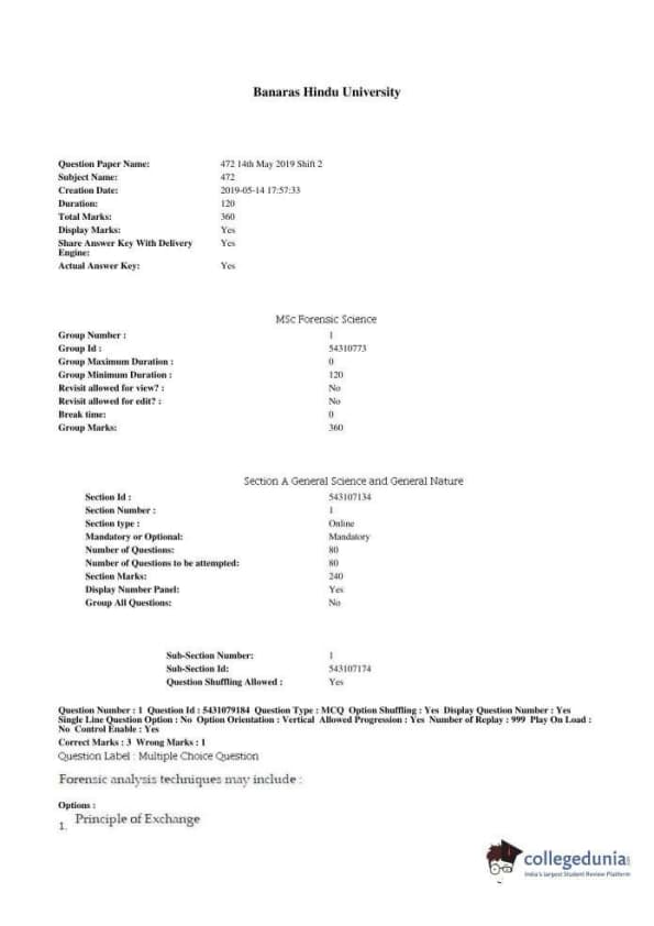 BHU PET 2019 M.SC. FORENSIC SCIENCE Question paper with answer key pdf conducted on May 14, 2019 in Shift 2 is available for download. The exam was successfully organized by Banaras Hindu University (BHU). The question paper comprised a total of 240 questions.