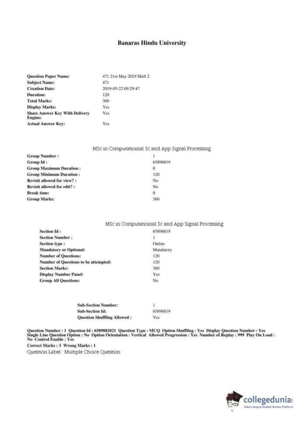 BHU PET 2019 MSC IN COMPUTATIOINAL SC AND APP SIGNAL PROCESSING Question paper with answer key pdf conducted on May 21, 2019 in Shift 2 is available for download. The exam was successfully organized by Banaras Hindu University (BHU). The question paper comprised a total of 120 questions.