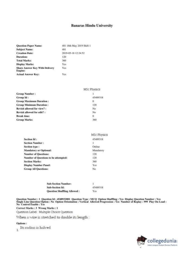 BHU PET 2019 M.SC. IN PHYSICS Question paper with answer key pdf conducted on May 18, 2019 in Shift 1 is available for download. The exam was successfully organized by Banaras Hindu University (BHU). The question paper comprised a total of 120 questions.