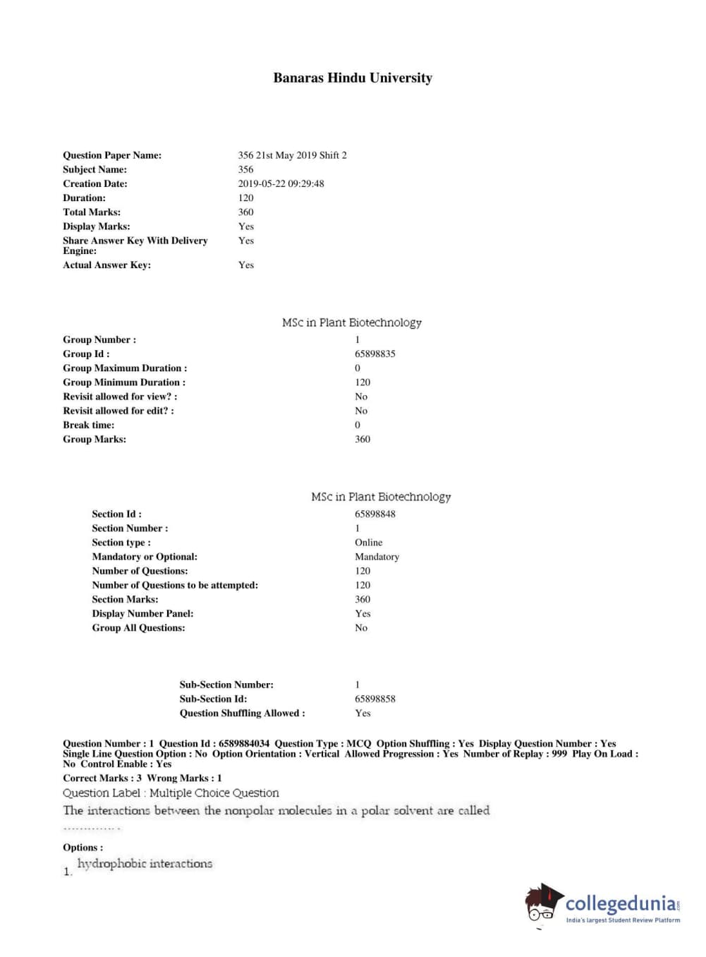 BHU PET 2019 MSC IN PLANT BIOTECHNOLOGY Question Paper with Answer Key PDFs in English ,Shift 2