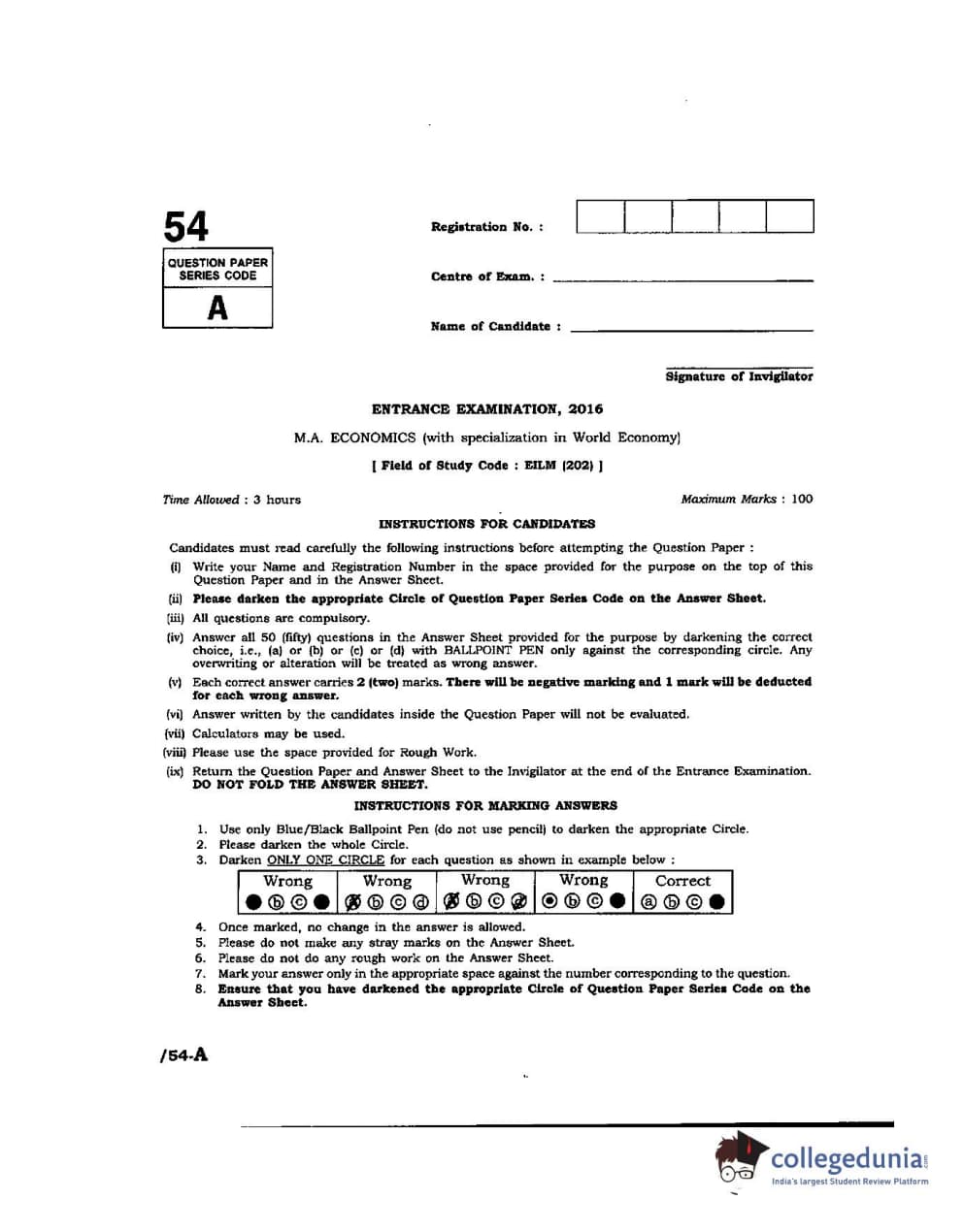 JNUEE 2016 M.A Economics with Specialization in World Economy Question paper with answer key pdf is available for download. The exam was successfully organized by Jawaharlal Nehru University (JNU). The question paper comprised a total of 50 questions.