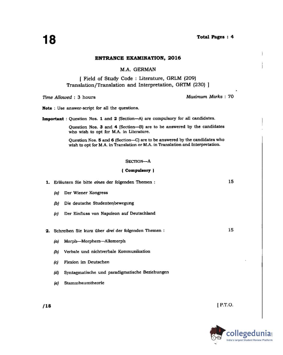 JNUEE 2016 M.A German Literature Question Paper with Answer Key PDFs