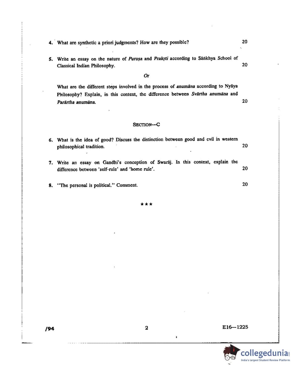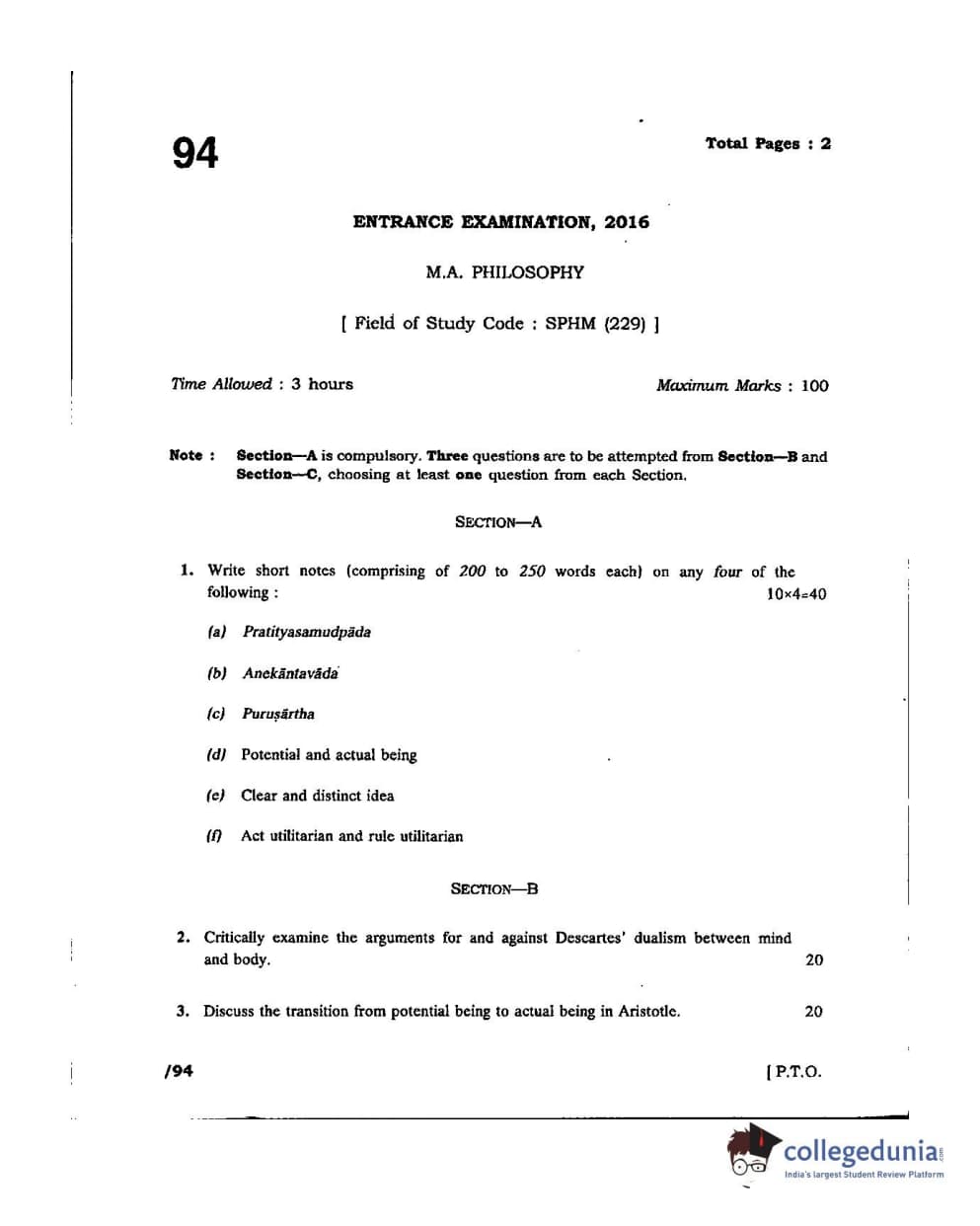 JNUEE 2016 M.A Philosophy Question paper with answer key pdf is available for download. The exam was successfully organized by Jawaharlal Nehru University (JNU). The question paper comprised a total of 8 questions.