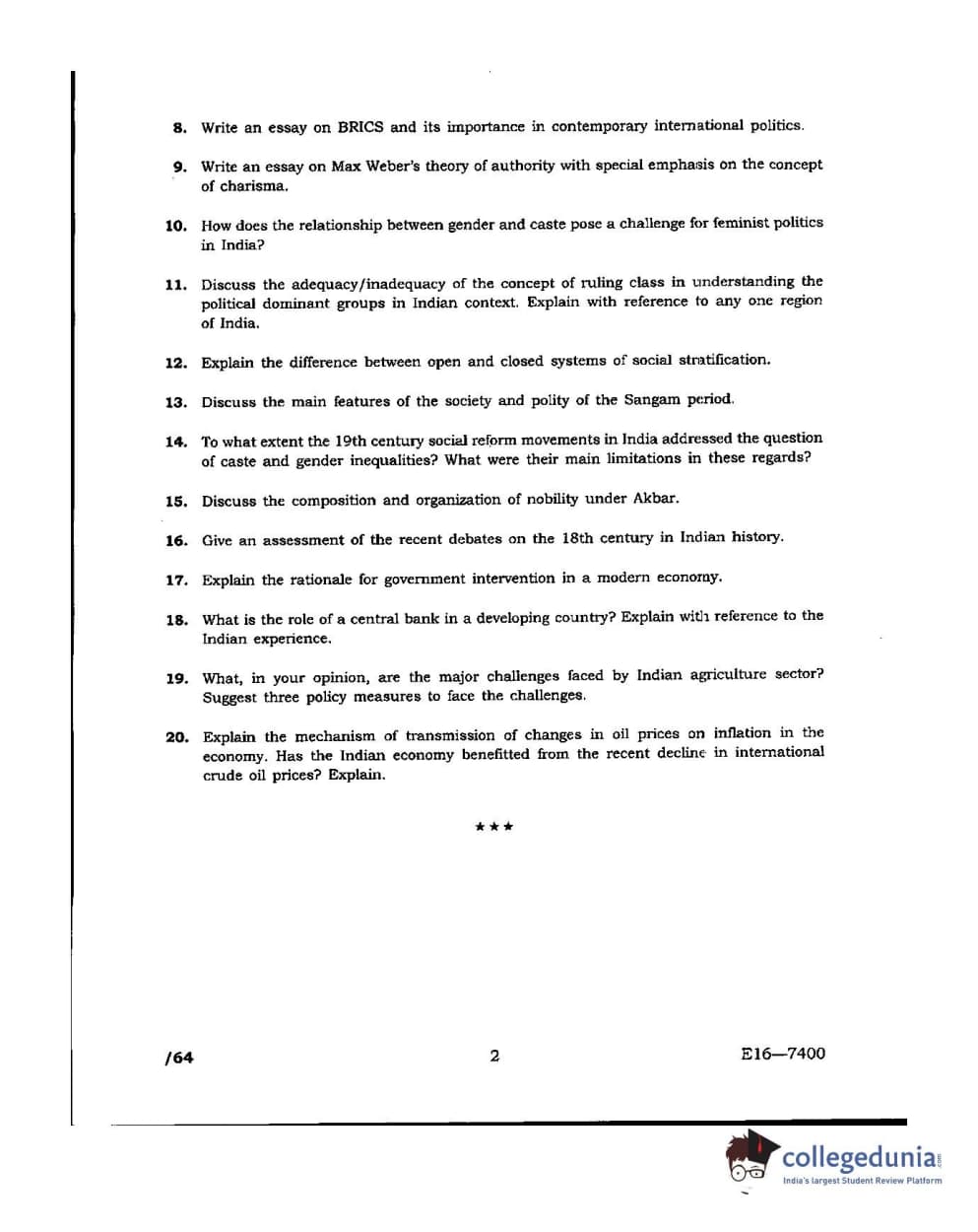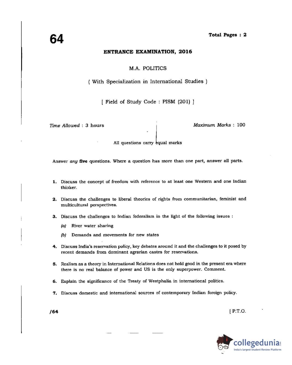 | JNUEE 2016 M.A Politics with Specialization In International Studies Question Paper PDF | JNUEE 2016 M.A Politics with Specialization In International Studies Answer Key PDF |