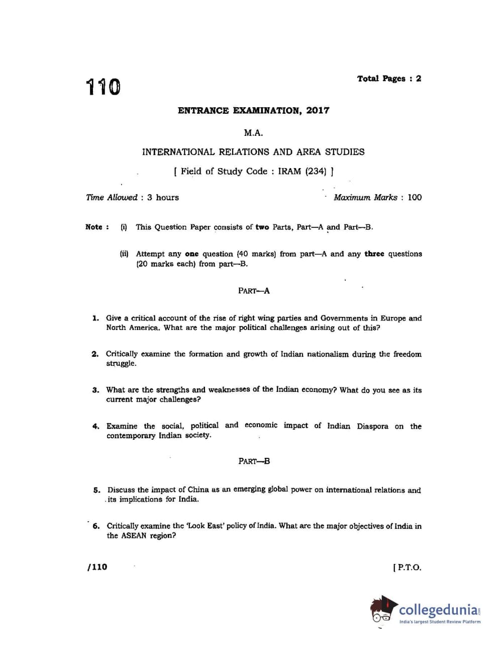 JNUEE 2017 M.A International Relations and Area Studies Question paper with answer key pdf is available for download. The exam was successfully organized by Jawaharlal Nehru University (JNU). The question paper comprised a total of 14 questions.