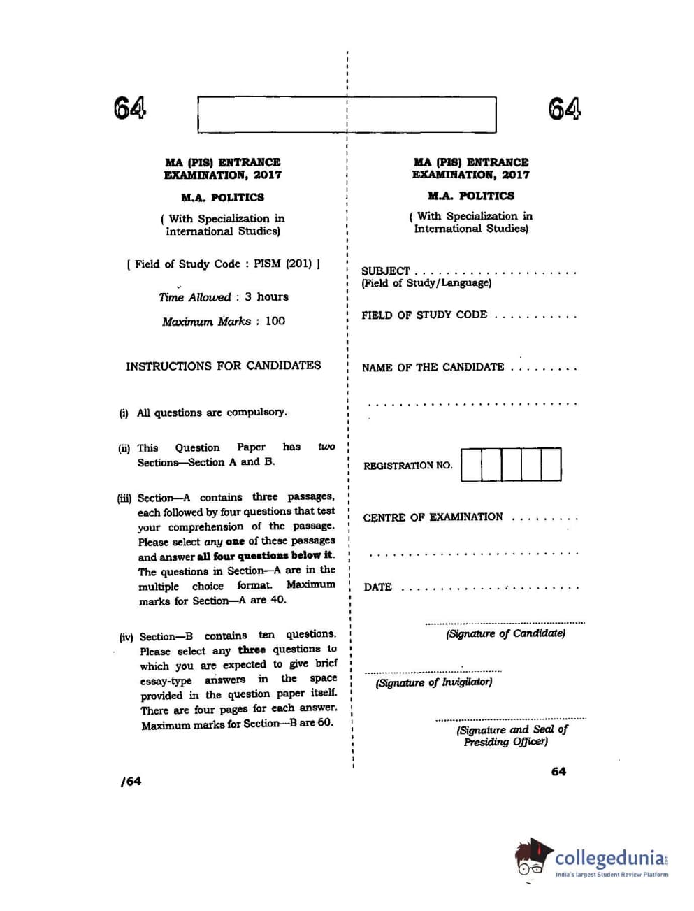 | JNUEE 2017 M.A Politics with Specialization In International Studies Question Paper PDF | JNUEE 2017 M.A Politics with Specialization In International Studies Answer Key PDF |
