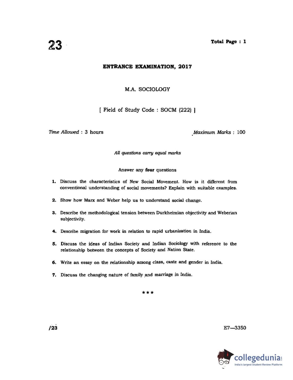 JNUEE 2017 M.A Sociology Question paper with answer key pdf is available for download. The exam was successfully organized by Jawaharlal Nehru University (JNU). The question paper comprised a total of 7 questions.