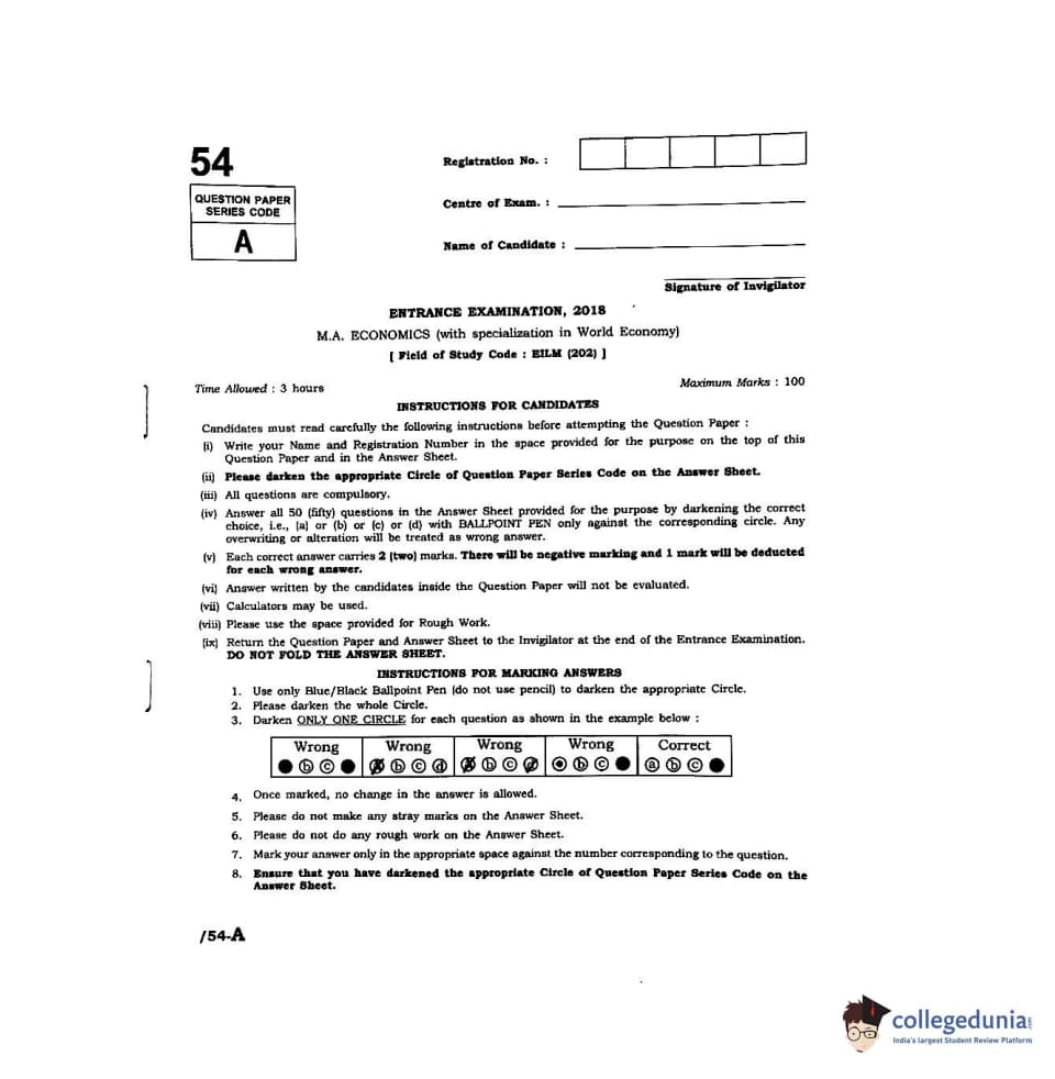 JNUEE 2018 M.A Economics with Specialization in World Economy Question paper with answer key pdf is available for download. The exam was successfully organized by Jawaharlal Nehru University (JNU). The question paper comprised a total of 50 questions.