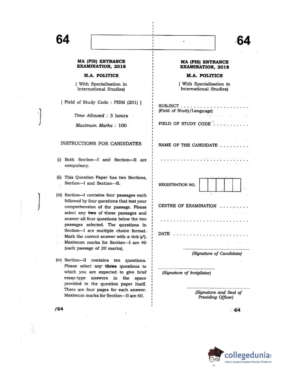| JNUEE 2018 M.A Politics with Specialization in International Studies Question Paper PDF | JNUEE 2018 M.A Politics with Specialization in International Studies Answer Key PDF |