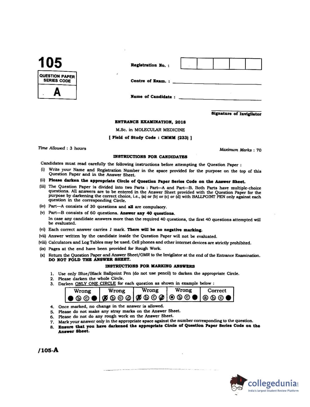 JNUEE 2018 M.Sc Molecular Medicine Question Paper with Answer Key PDFs