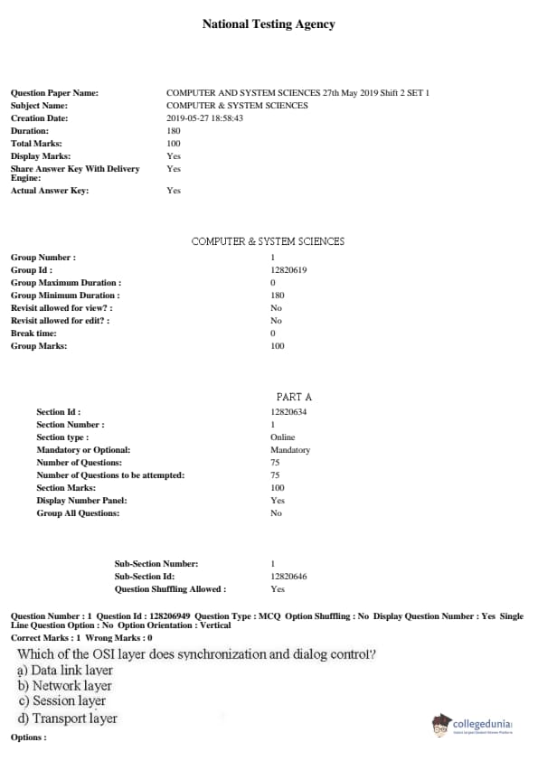 JNUEE 2019 M.Phil Computer and system science Shift 1 Set1 Question paper with answer key pdf conducted on May 27, 2019 is available for download. The exam was successfully organized by National Testing Agency (NTA). The question paper comprised a total of 75 questions.
