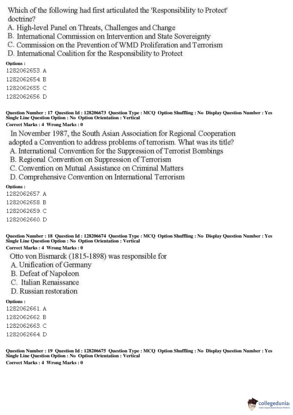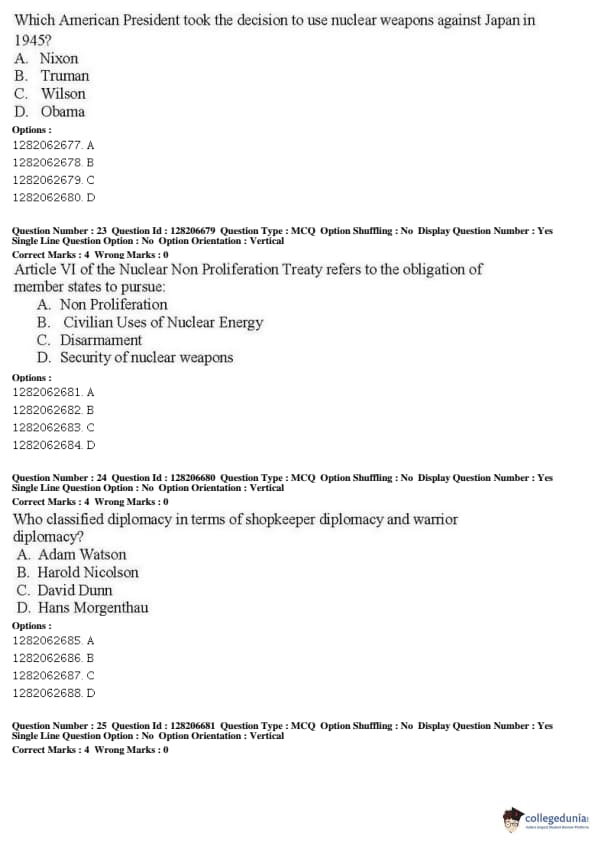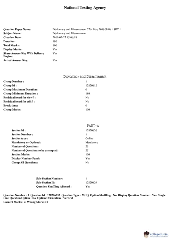 JNUEE 2019 M.Phil Diplomacy and Disarmament Question paper with answer key pdf conducted on May 27, 2019 in Shift 1 is available for download. The exam was successfully organized by National Testing Agency (NTA). The question paper comprised a total of 25 questions.