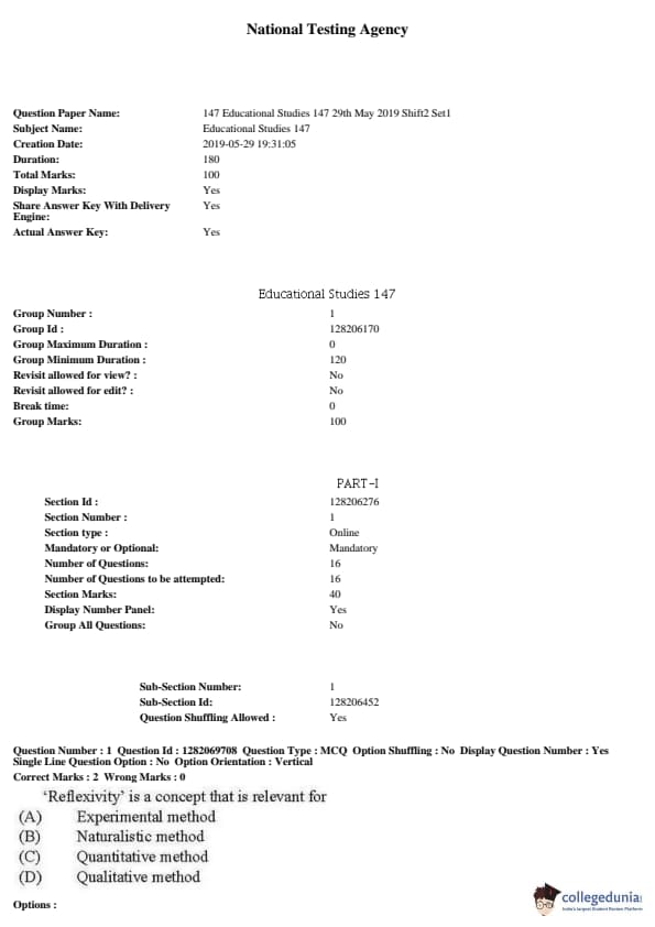 JNUEE 2019 M.Phil Educational Studies Question paper with answer key pdf conducted on May 27, 2019 in Shift 2 is available for download. The exam was successfully organized by National Testing Agency (NTA). The question paper comprised a total of 140 questions.