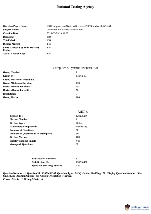 JNUEE 2019 Ph.D Computer and Systems Sciences Question paper with answer key pdf conducted on May 29, 2019 in Shift 2 is available for download. The exam was successfully organized by National Testing Agency (NTA). The question paper comprised a total of 50 questions.