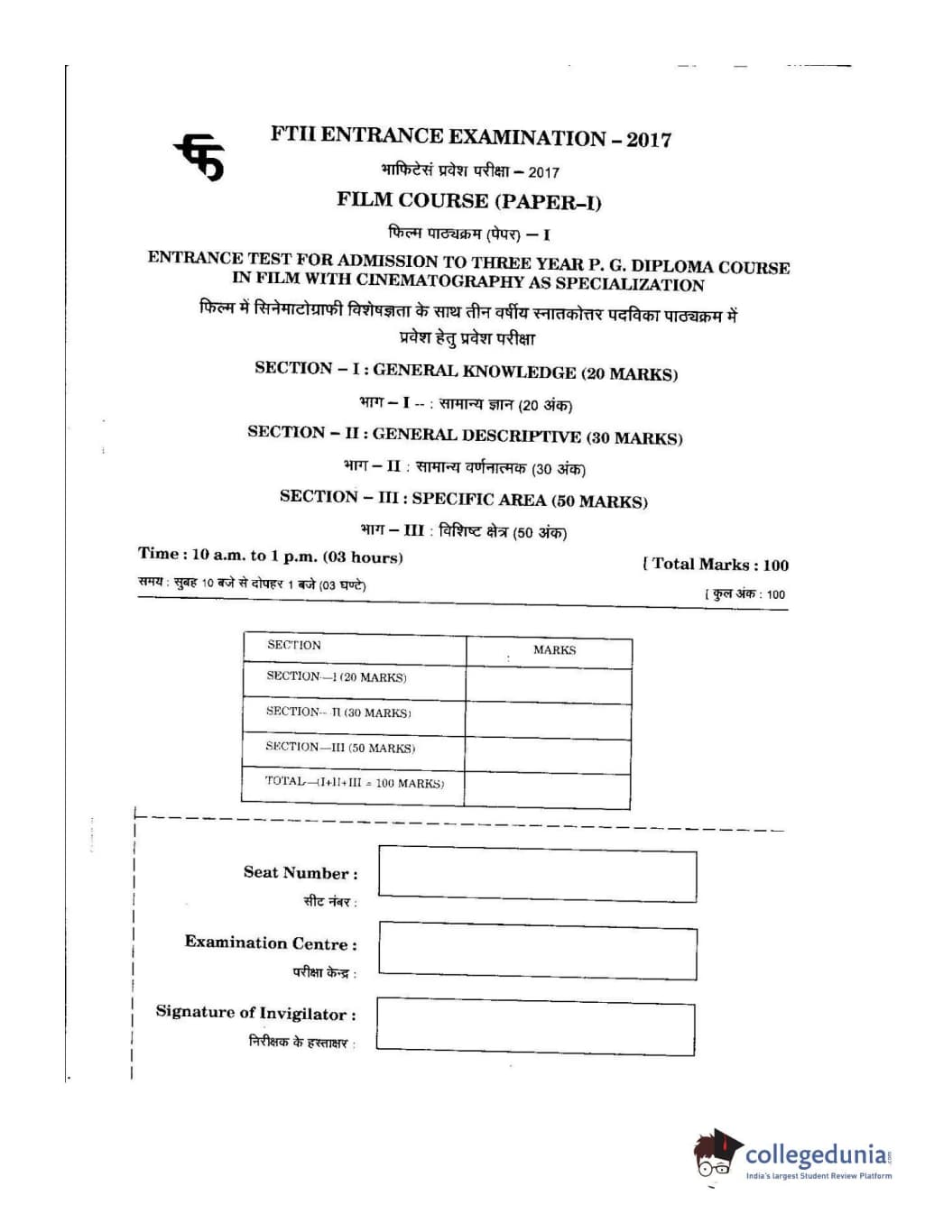 | FTII Entrance Exam 2017 PG Diploma in Cinematography Question Paper PDF | FTII Entrance Exam 2017 PG Diploma in Cinematography Answer Key PDF |