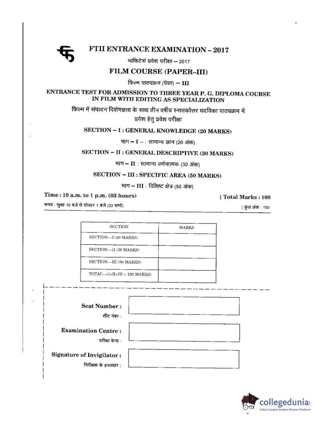 FTII Entrance Exam 2017 Three Year Post Graduate Diploma in Editing Question paper with answer key pdf conducted on March 26, 2017 in Forenoon Session 10 AM to 1 PM is available for download. The exam was successfully organized by Film and Television Institute of India (FTII). The question paper comprised a total of 26 questions divided among three sections.