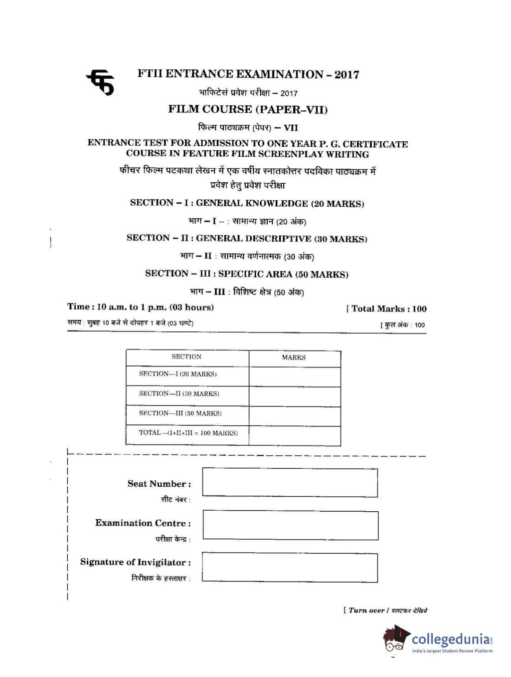 FTII Entrance Exam 2017 One Year Post Graduate Diploma in Feature Film Screenplay Writing Question paper with answer key pdf conducted on March 26, 2017 in Forenoon Session 10 AM to 1 PM is available for download. The exam was successfully organized by Film and Television Institute of India (FTII). The question paper comprised a total of 27 questions divided among three sections.