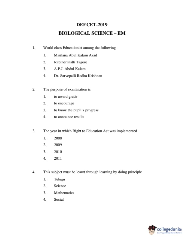 AP DEECET 2019 Biological Science Question paper with answer key pdf conducted on May-15 is available for download. The exam was successfully organized by Directorate of School Education, Government of AP. The question paper comprised a total of 100 questions.