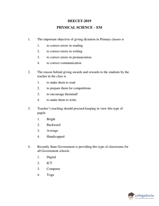 AP DEECET 2019 Physical Science Question paper with answer key pdf is available for download. The exam was successfully organized by Directorate of School Education, Government of AP. The question paper comprised a total of 100 questions.
