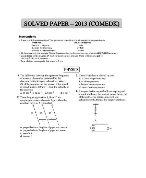 COMEDK UGET 2013 Question Paper is available here for download. Consortium of Medical, Engineering and Dental Colleges of Karnataka (COMEDK) had conducted COMEDK UGET 2013 on May 12 from 9:00 AM to 12:00 PM. COMEDK UGET Question Paper consists of 60 MCQ-based questions in three subjects each: Physics, Chemistry and Mathematics. For each correct answer, +1 mark was awarded, there is no negative marking in COMEDK UGET Question Paper.