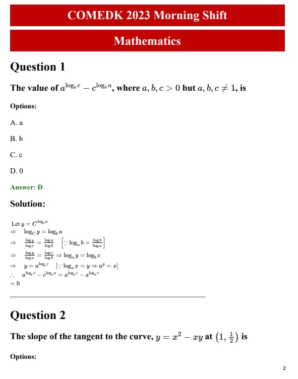 | COMEDK UGET 2023 (Shift 1) Question Paper With Answer Key | Check Solution |