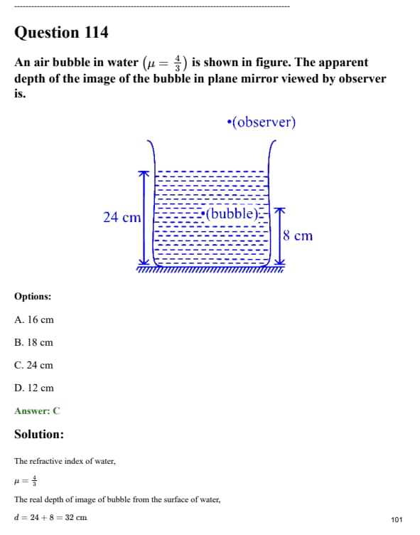 An air bubble in water (\( \mu = \frac{4}{3} \)) is shown in the figure. The apparent depth of the image of the bubble in a plane mirror viewed by the observer is.