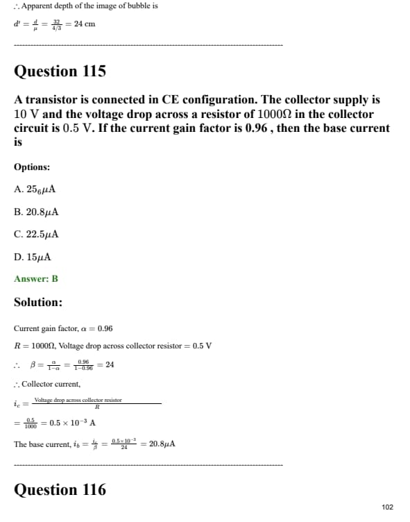 A transistor is connected in CE configuration. The collector supply is 10 V and the voltage drop across a resistor of 1000 \( \Omega \) in the collector circuit is 0.5 V. If the current gain factor is 0.96, then the base current is