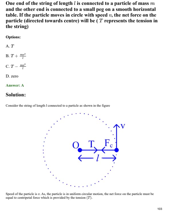 One end of the string of length \( l \) is connected to a particle of mass \( m \) and the other end is connected to a small peg on a smooth horizontal table. If the particle moves in a circle with speed \( v \), the net force on the particle (directed towards the center) will be (T represents the tension in the string)