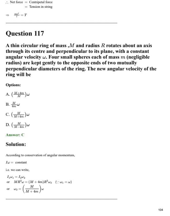 A thin circular ring of mass \( M \) and radius \( R \) rotates about an axis through its centre and perpendicular to its plane, with a constant angular velocity \( \omega \). Four small spheres each of mass \( m \) (negligible radius) are kept gently to the opposite ends of two mutually perpendicular diameters of the ring. The new angular velocity of the ring will be