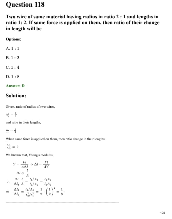 Two wires of the same material having radius in ratio 2 : 1 and lengths in ratio 1 : 2. If the same force is applied on them, then the ratio of their change in length will be