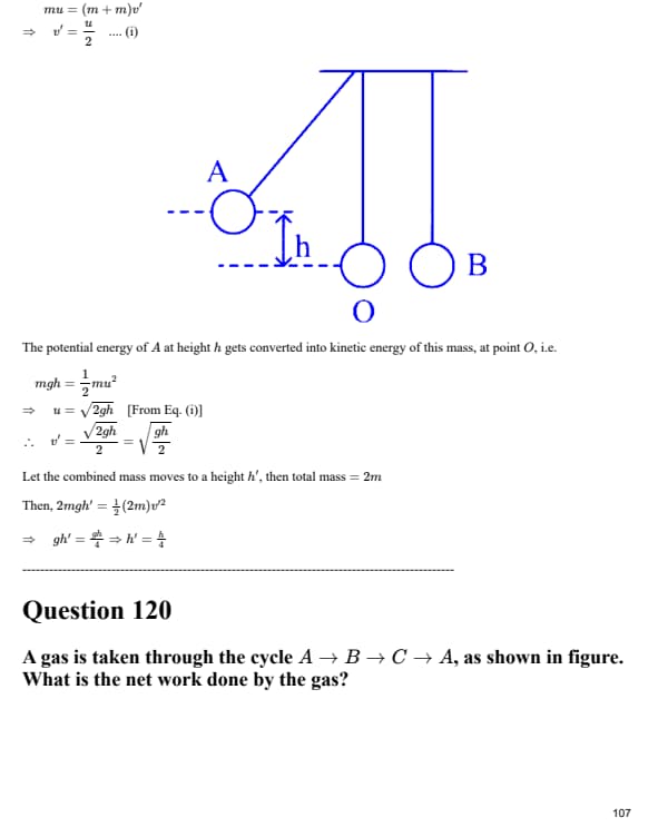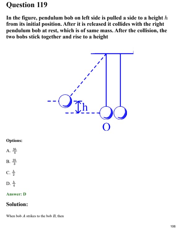 In the figure, pendulum bob on the left side is pulled aside to a height \( h \) from its initial position. After it is released, it collides with the right pendulum bob at rest, which is of the same mass. After the collision, the two bobs stick together and rise to a height