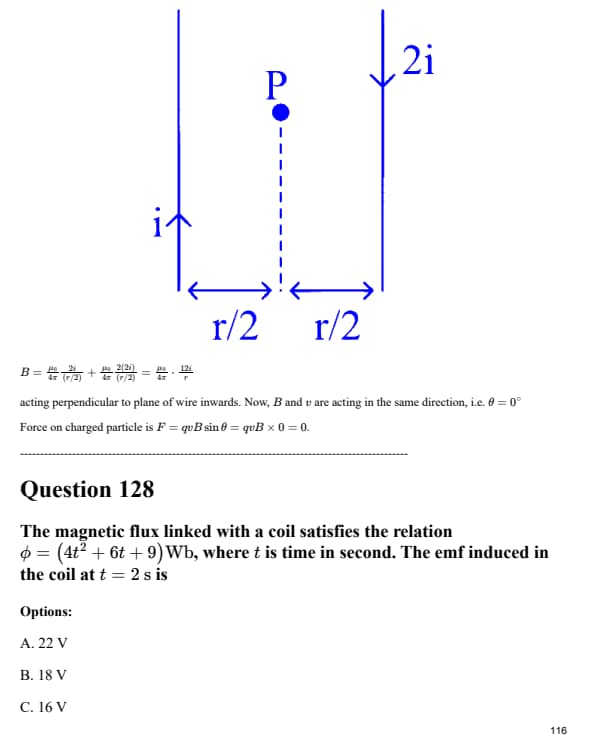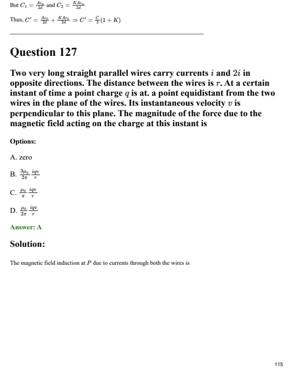 Two very long straight parallel wires carry currents \( i \) and \( 2i \) in opposite directions. The distance between the wires is \( r \). At a certain instant of time a point charge \( q \) is at a point equidistant from the two wires in the plane of the wires. Its instantaneous velocity \( v \) is perpendicular to this plane. The magnitude of the force due to the magnetic field acting on the charge at this instant is