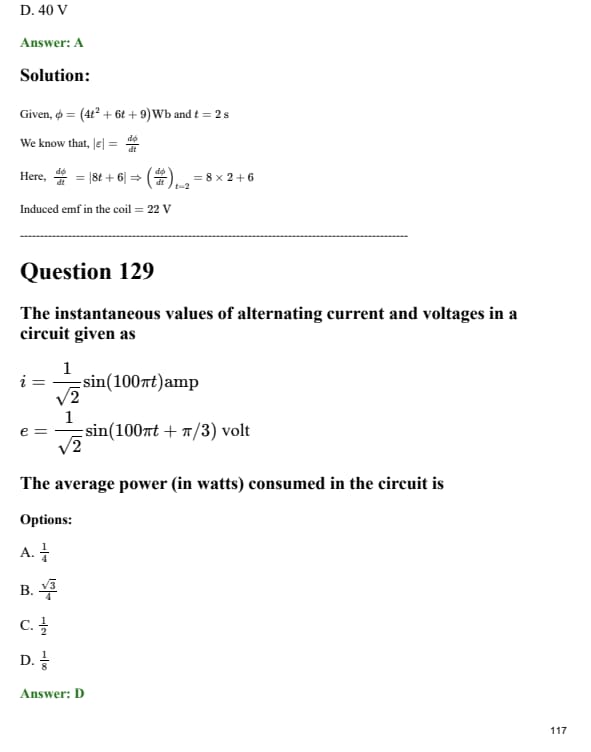 The magnetic flux linked with a coil satisfies the relation \( \phi = (4t^2 + 6t + 9) \, Wb \), where \( t \) is time in seconds. The emf induced in the coil at \( t = 2 \) seconds is