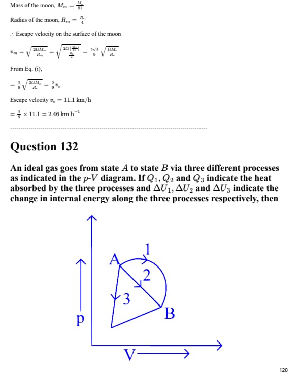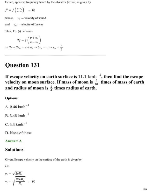 If escape velocity on Earth surface is 11.1 km/h\(^{-1}\), then find the escape velocity on the Moon surface. If the mass of the Moon is \( \frac{1}{81} \) times the mass of the Earth and the radius of the Moon is \( \frac{1}{4} \) times the radius of Earth.