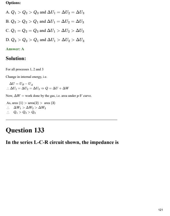 An ideal gas goes from state A to state B via three different processes as indicated in the p-V diagram. \( Q_1 \), \( Q_2 \), and \( Q_3 \) indicate the heat absorbed by the three processes and \( \Delta U_1 \), \( \Delta U_2 \), and \( \Delta U_3 \) indicate the change in internal energy along the three processes respectively, then