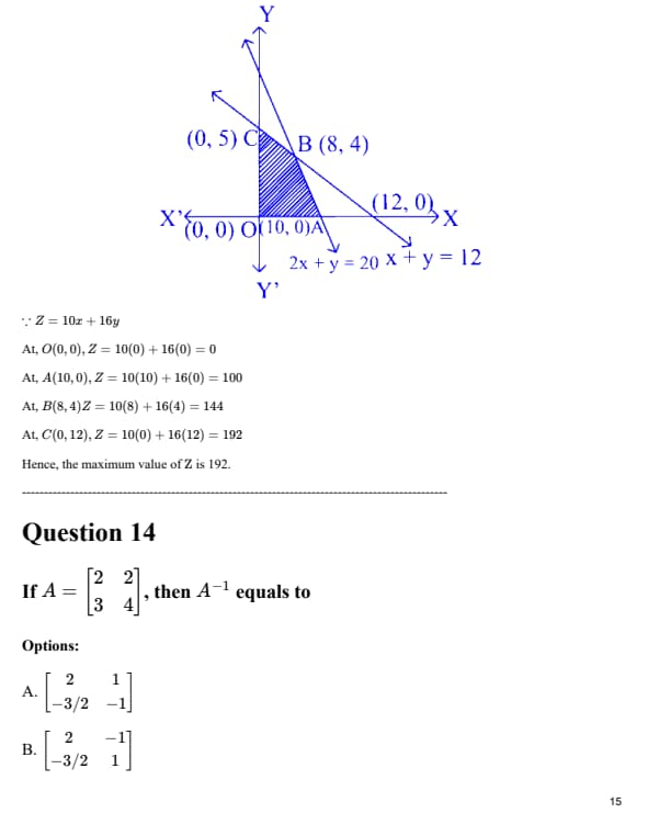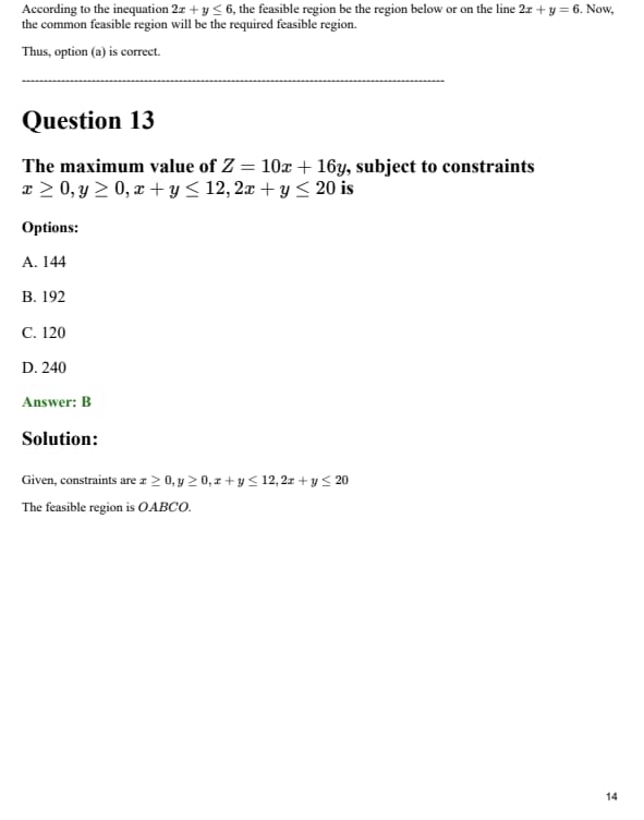 The maximum value of Z = 10x + 16y, subject to constraints \[ x \geq 0, \quad y \geq 0, \quad x + y \leq 12, \quad 2x + y \leq 20 \]