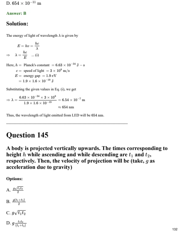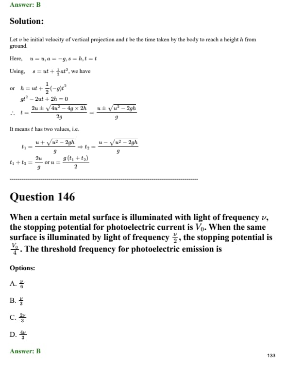 A body is projected vertically upwards. The times corresponding to height \( h \) while ascending and while descending are \( t_1 \) and \( t_2 \), respectively. Then, the velocity of projection will be (take \( g \) as acceleration due to gravity)